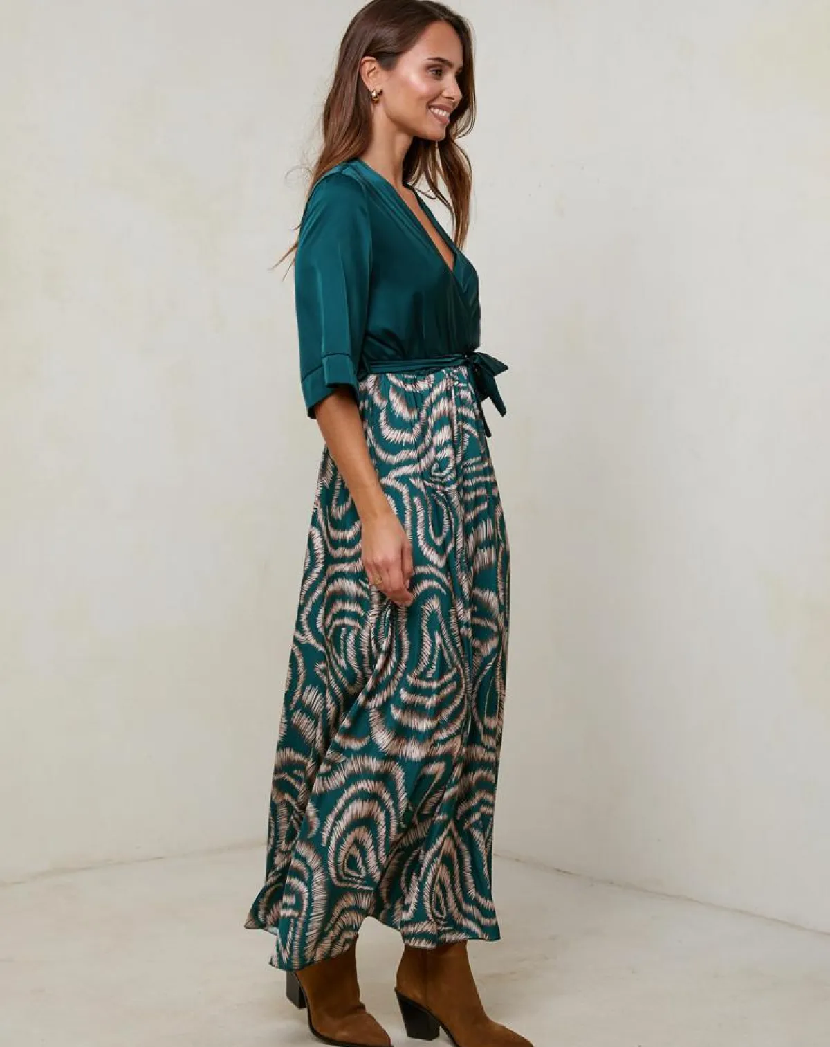 Robe longue col V manches trois quart avec motifs sur le bas ceinture à la taille