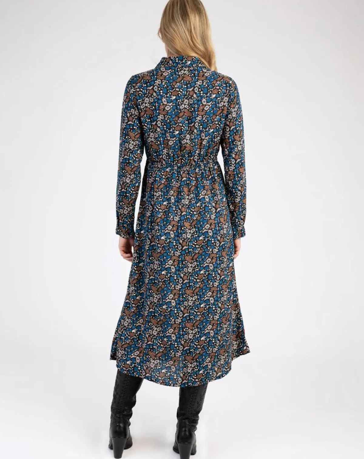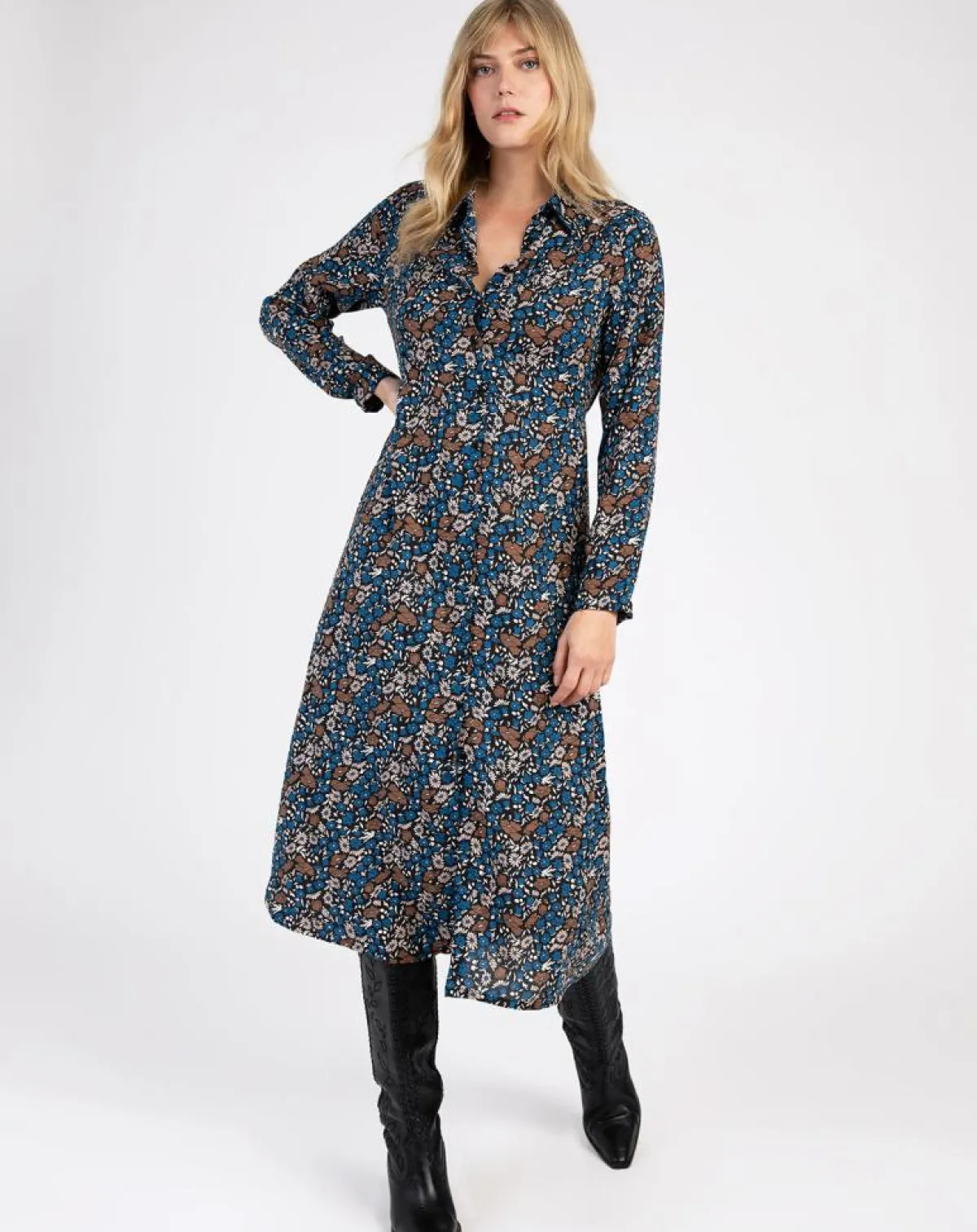Cette robe midi MANTRY associe un col chemise et des manches longues légèrement ajustée