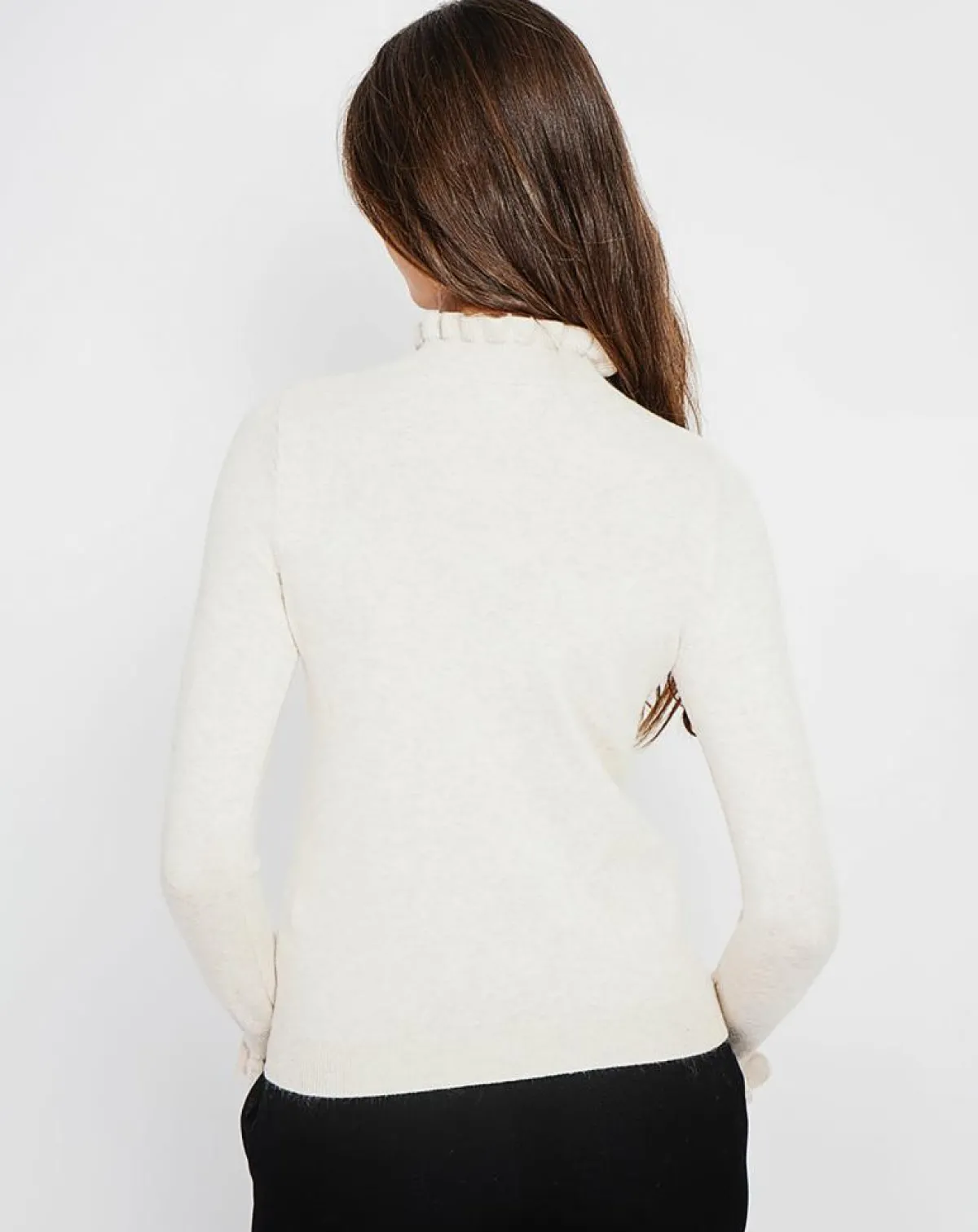 Pull col montant à volants et bas manche longue à volants