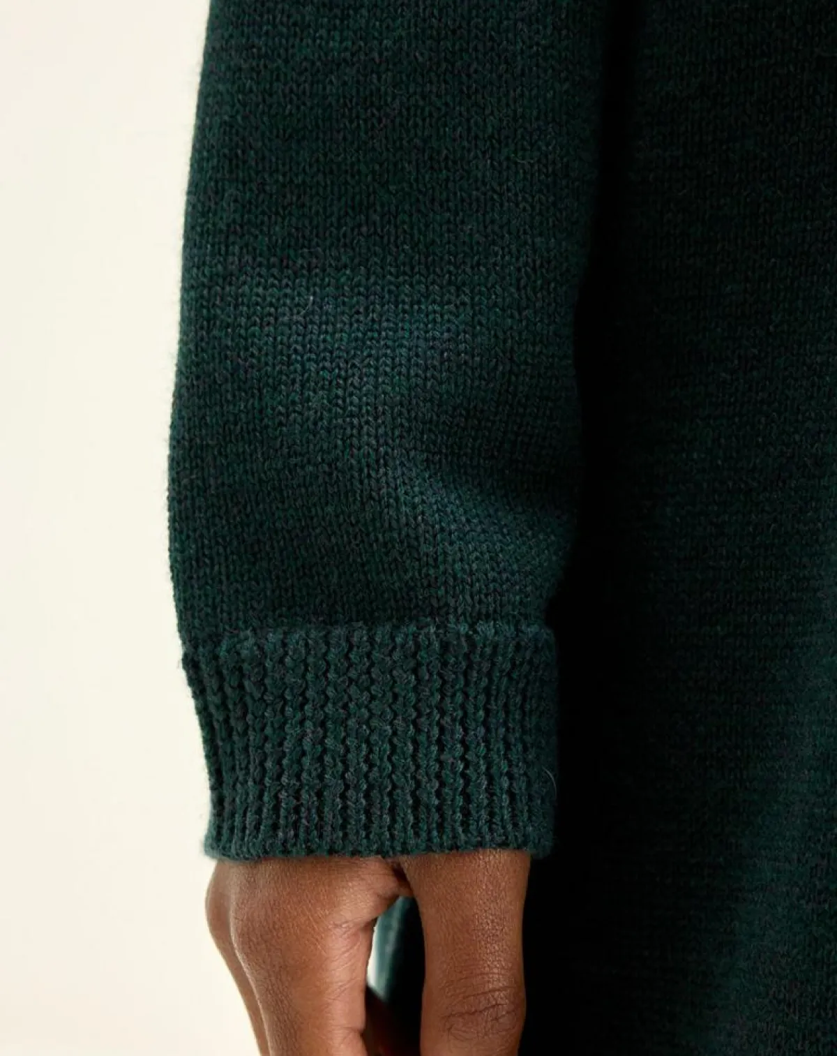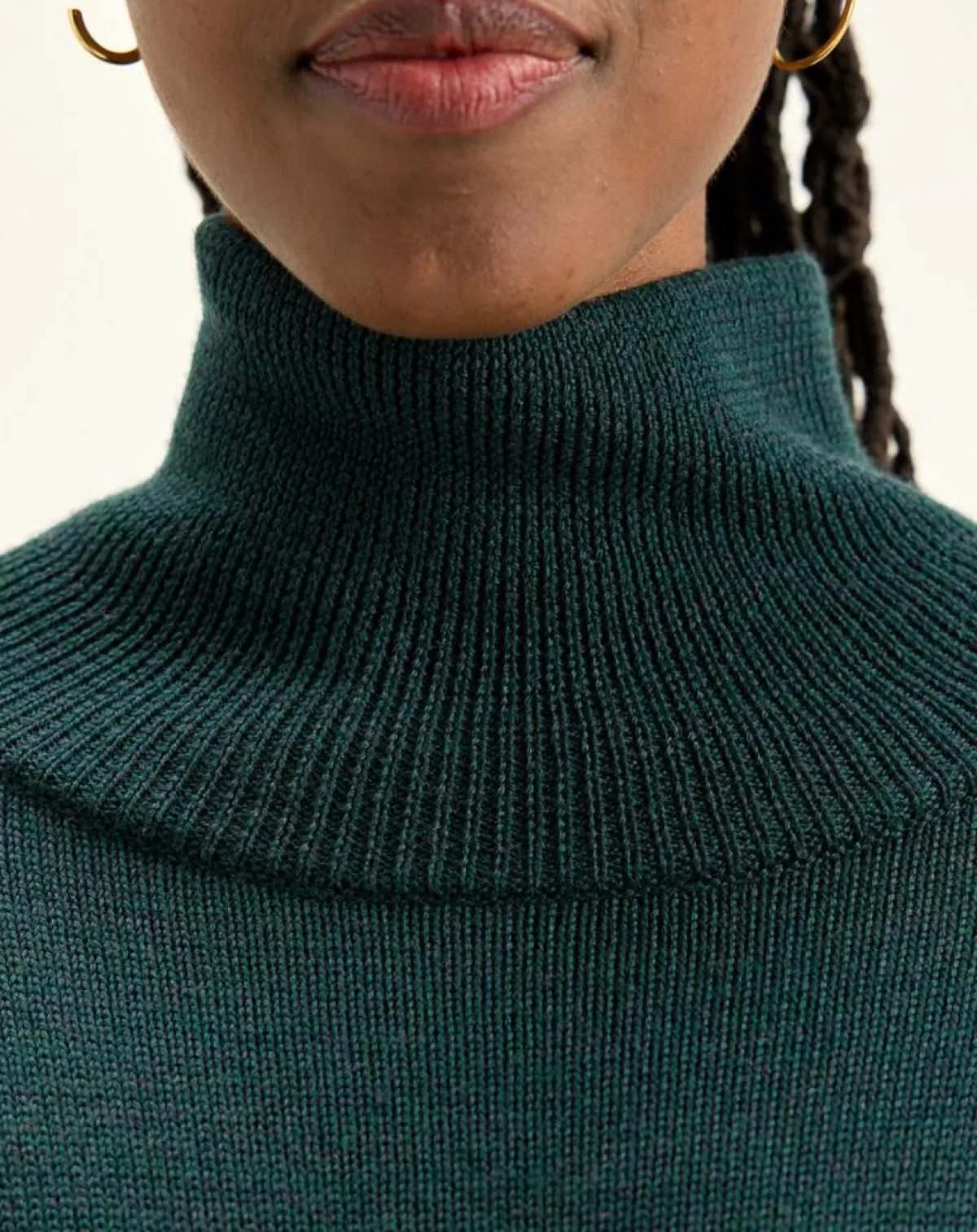 Robe pull oversize en mérinos extra fin couleur vert bouteille, col roulé en maille côtelée tricoté double