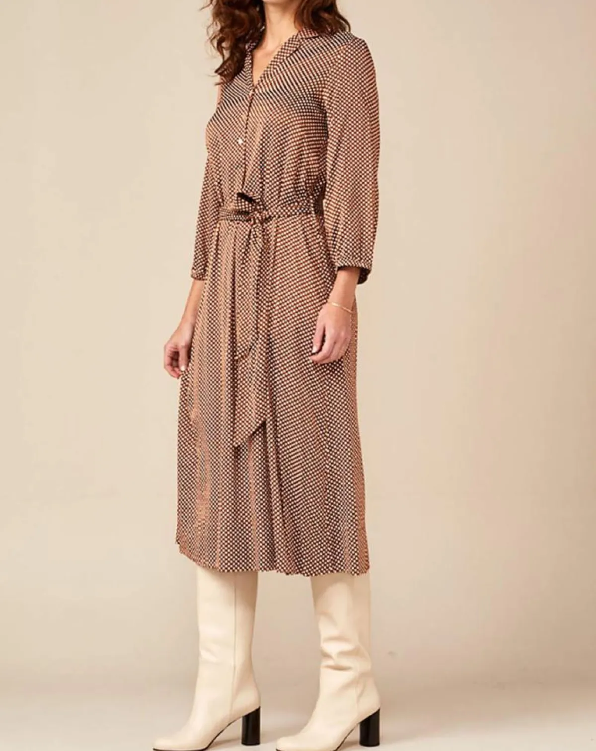 La robe ARMORY saura vous séduire par son aisance, sa coupe évasée et sa taille resserrée par une ceinture large