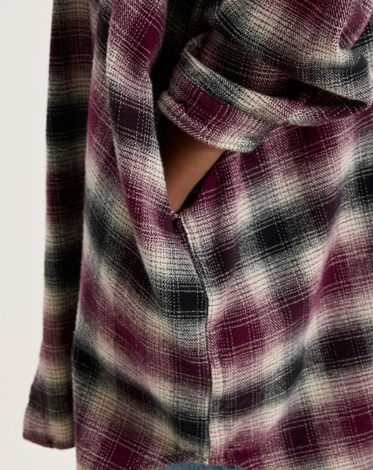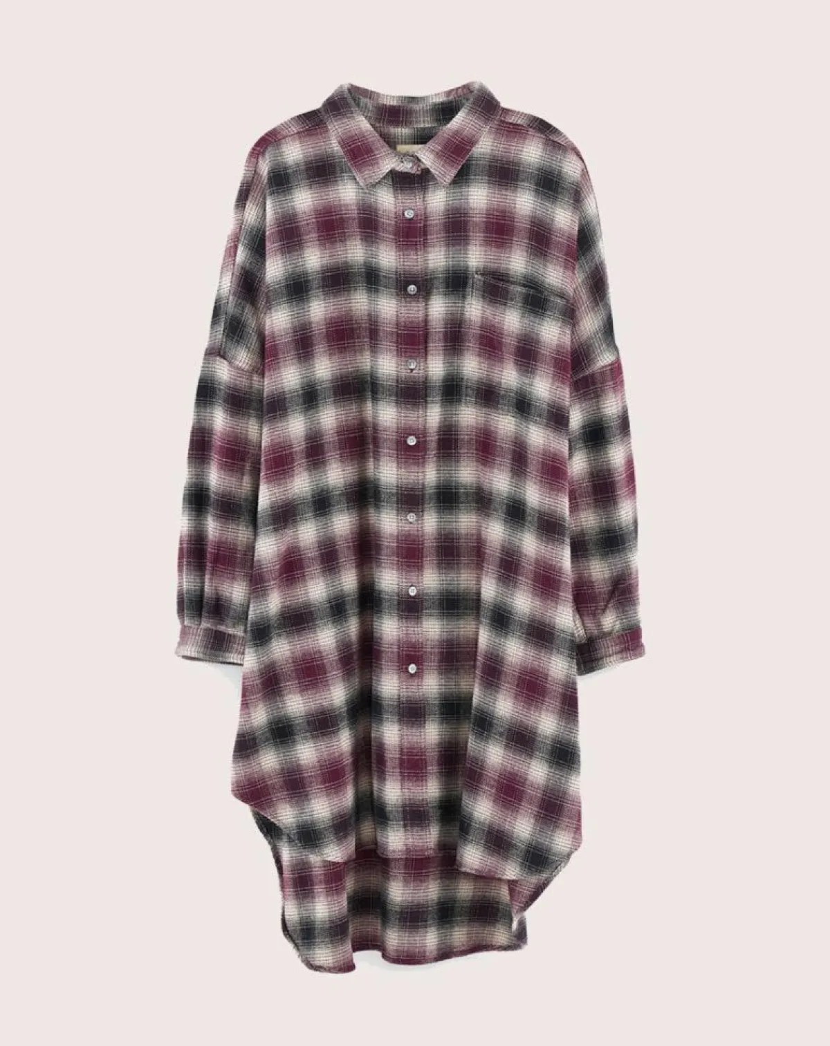 Robe chemise à manches longues, coupe oversize fabriquée en coton brossé à carreaux rouges, noirs et écrus