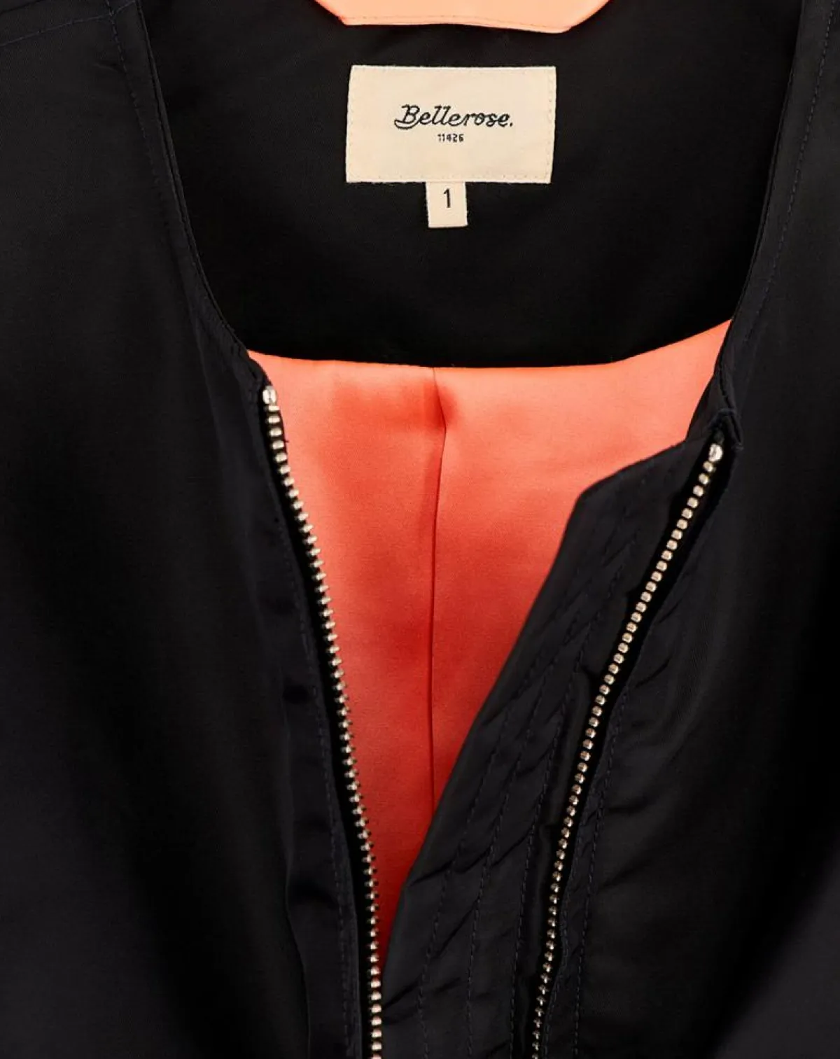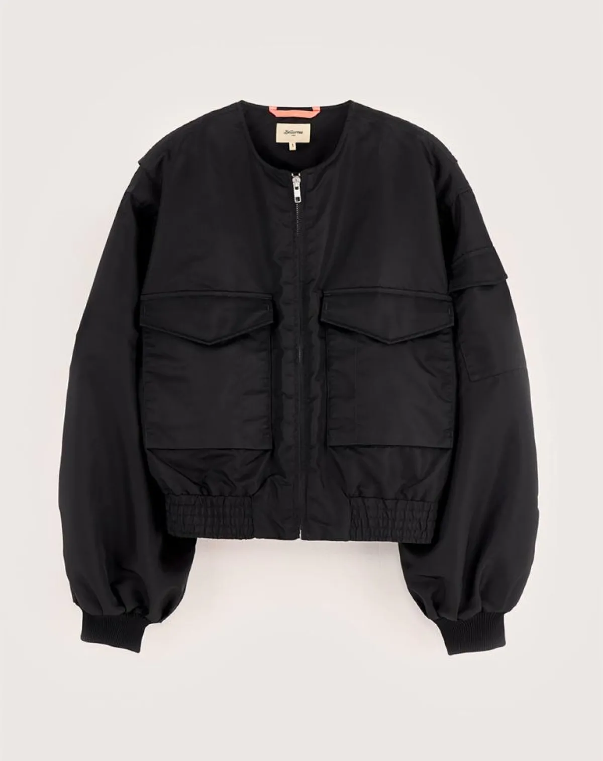 Veste sans col forme pilote en toile off black avec fermeture par zip argenté