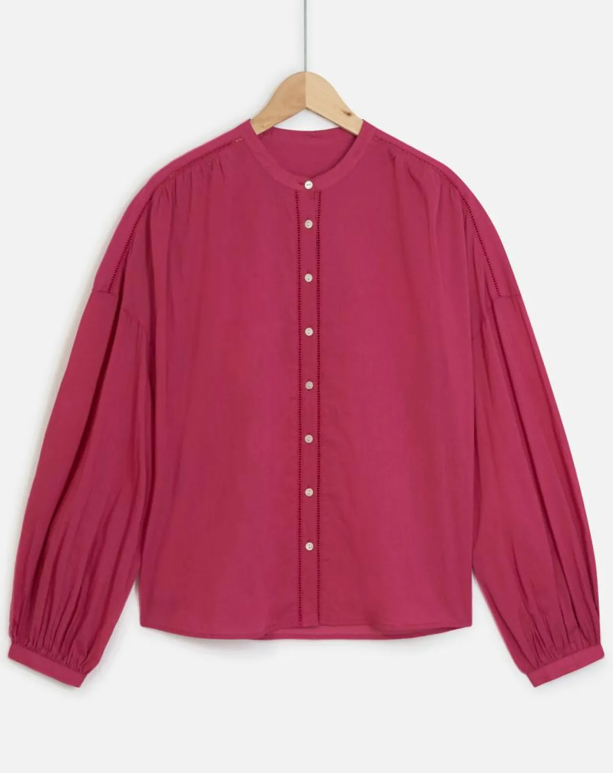 Le coloris groseille de la chemise Clarisse accompagnera à merveille et rehaussera tous vos bas aux teintes beiges, écru, camel