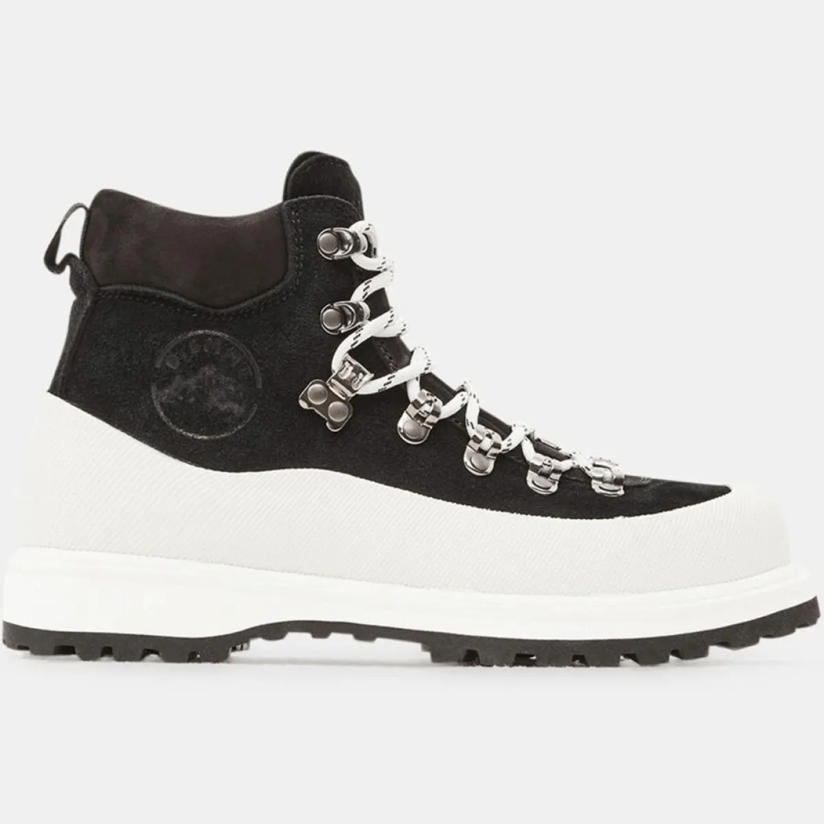 Ces boots de marche Diemme présentent une empeigne en daim avec large bordure contrastante texturée, un bout arrondi, un laçage 7 œillets métalliques, une languette rembourrée comme la cheville, une signature embossée, un intérieur cuir avec semelle Eurosole et une semelle extérieure crantée en caoutchouc.
