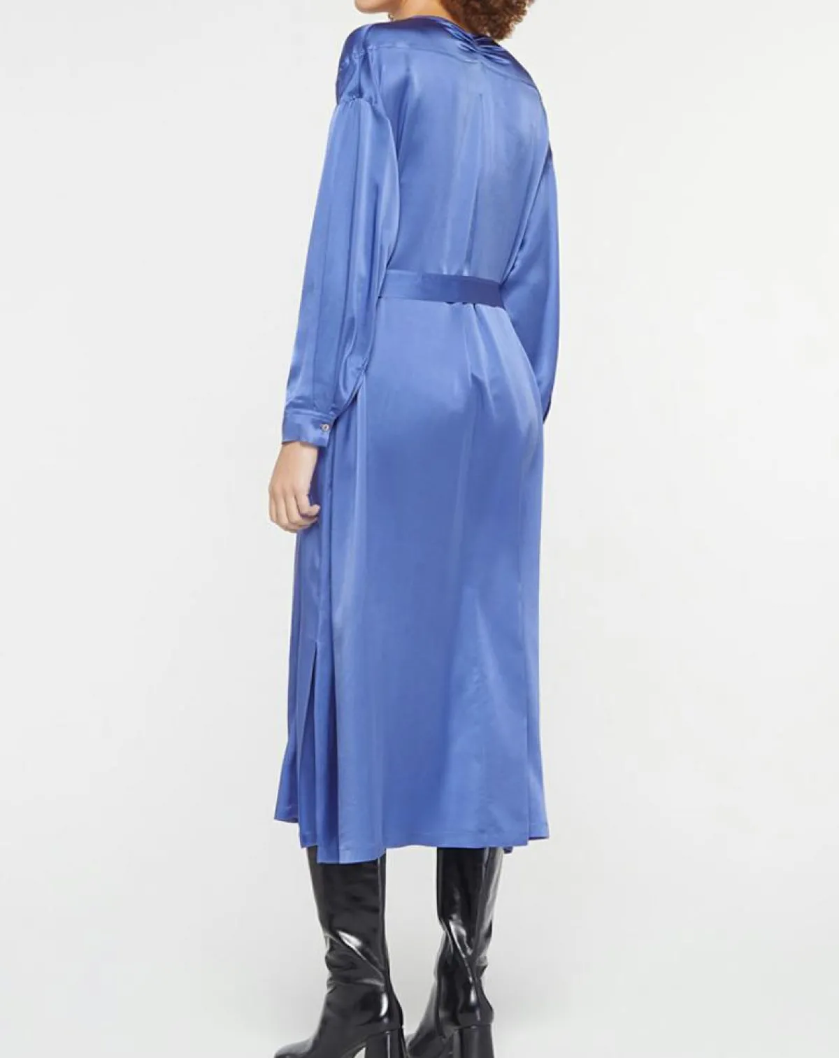 Cette robe longue fluide Forte_Forte en soie est munie d’un décolleté croisé en V avec boutons pression, de manches longues, de 2 poches prises dans la couture, d’une ceinture à nouer et de fentes latérales à la base.