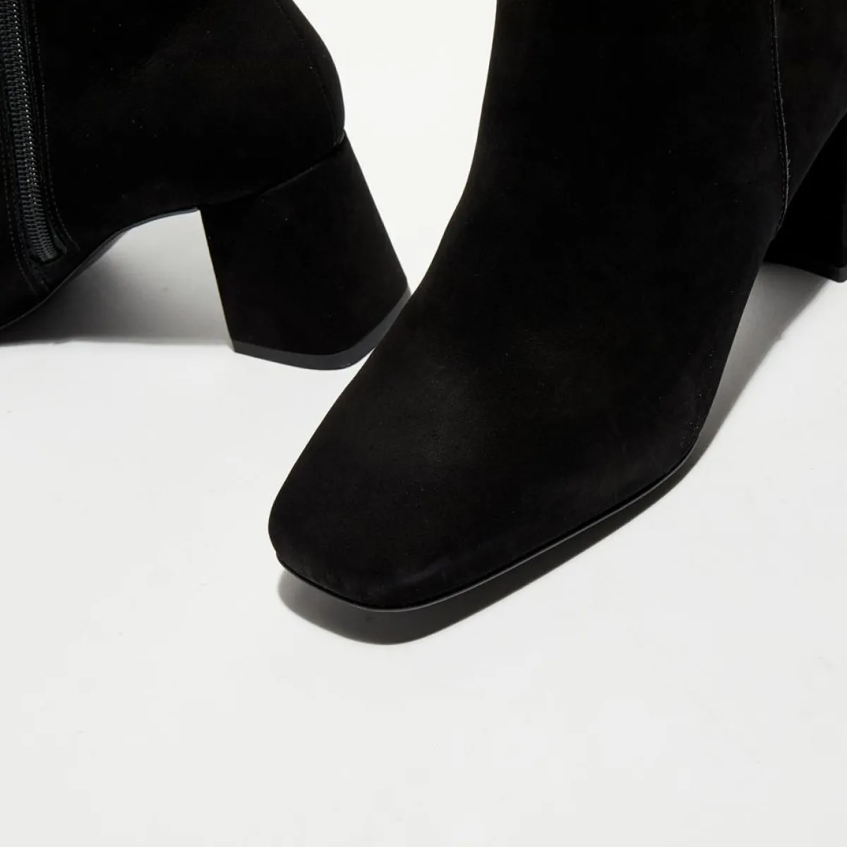 Elles présentent un bout arrondi, une fermeture zippée, un détail boucle sur le côté, un tirant d’enfilage sur l’arrière et un talon large.