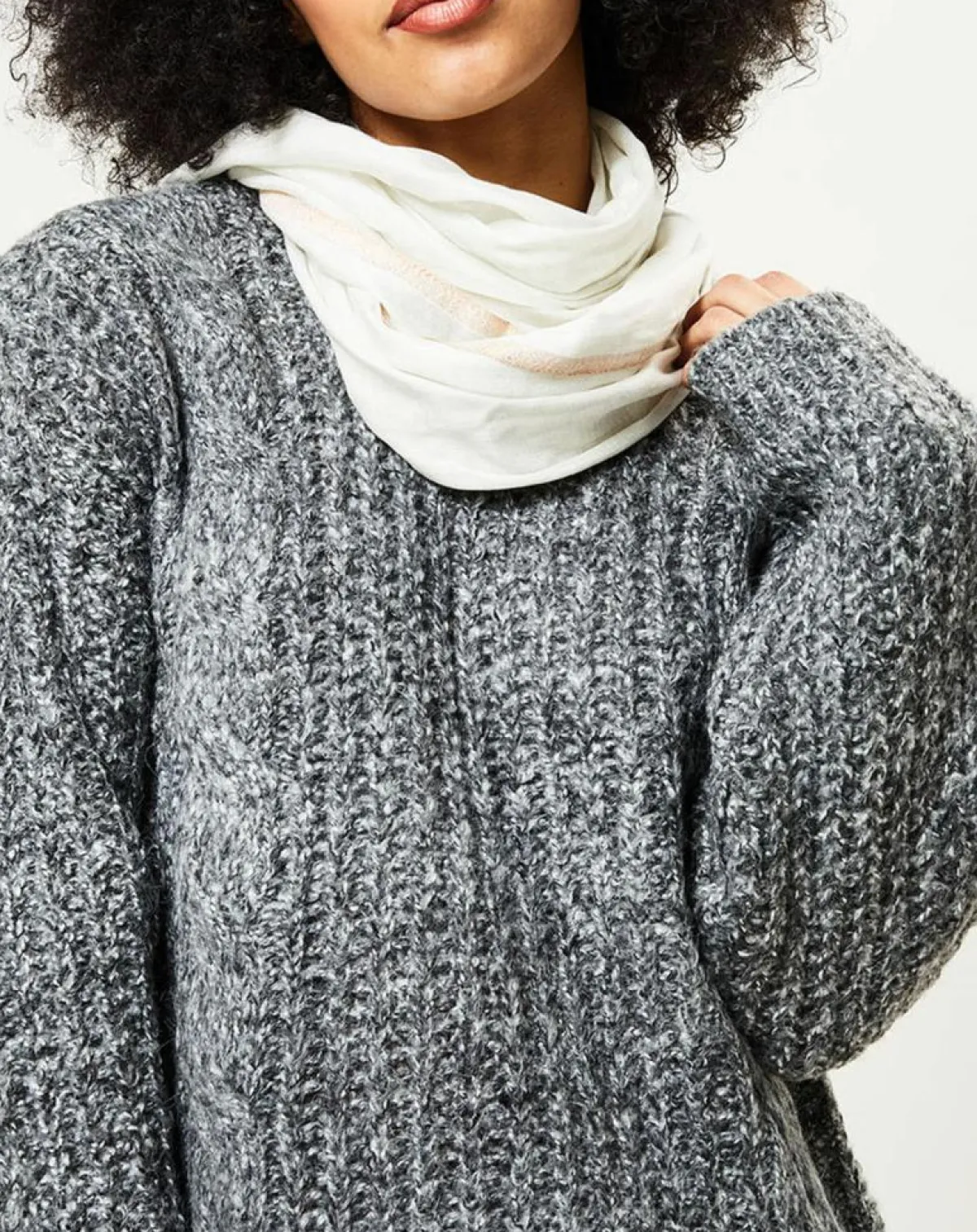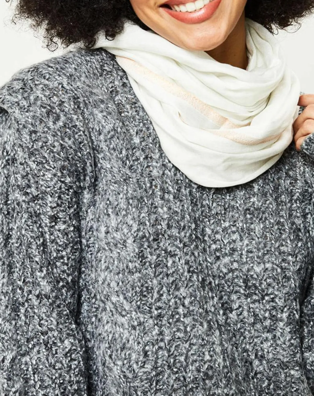 Cette étole Galeries Lafayette présente des bordures en lurex doré ainsi que des franges aux extrémités.