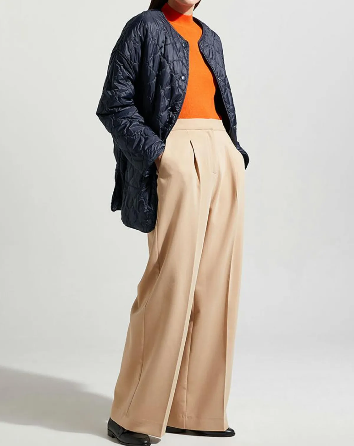 Elle est munie d’un col V, d’une fermeture à boutons pression, de poches passepoilées ainsi que d’un ourlet fendu.