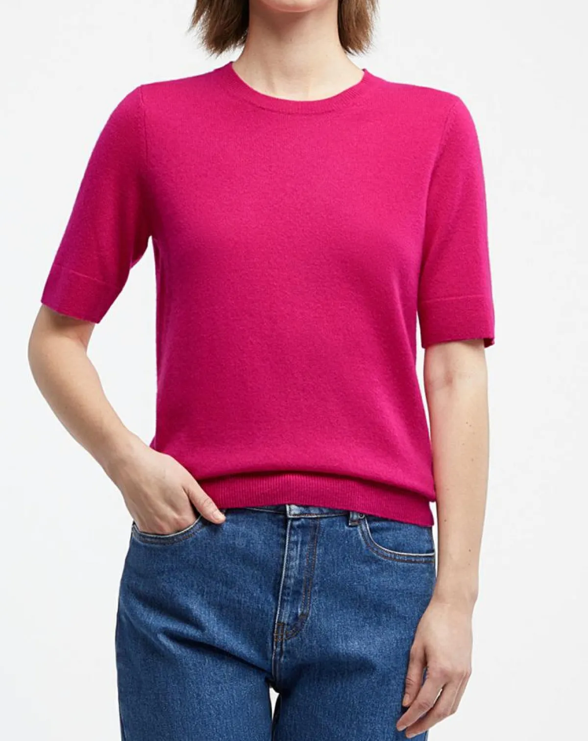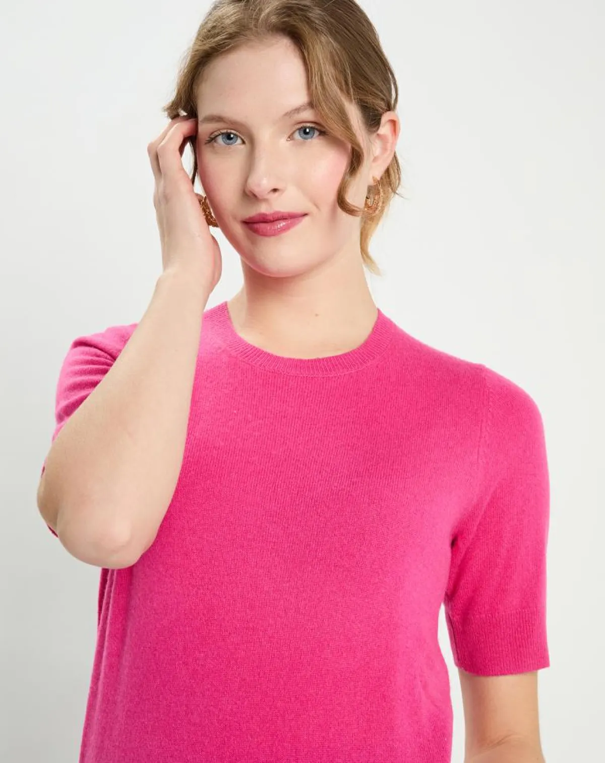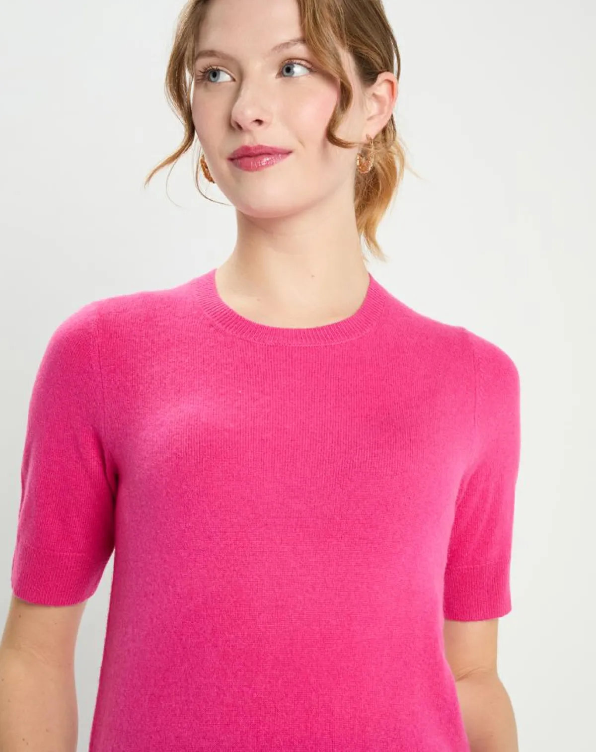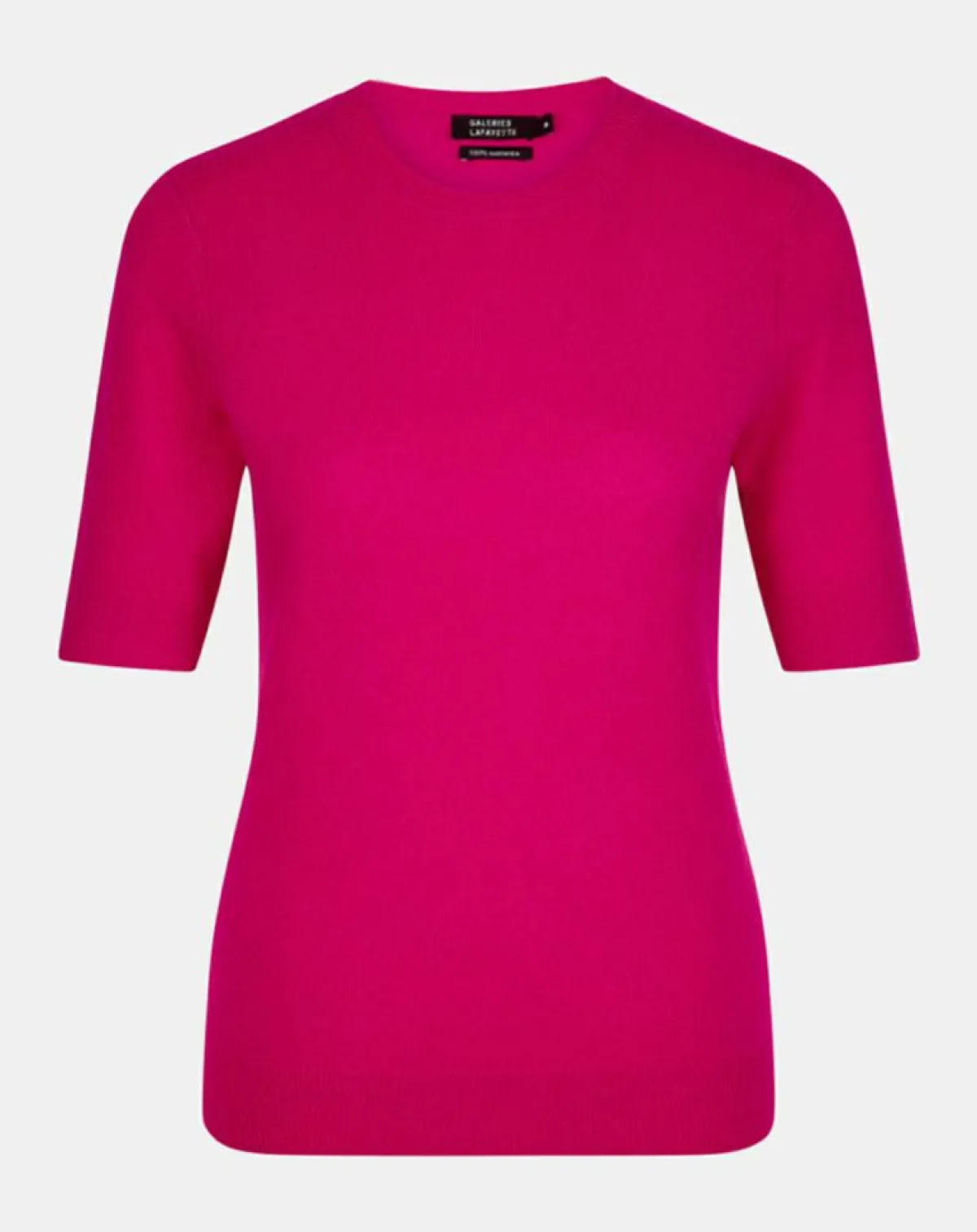 Ce pull droit Galeries Lafayette en cachemire est muni de manches courtes, d’un col rond et de finitions côtelées.