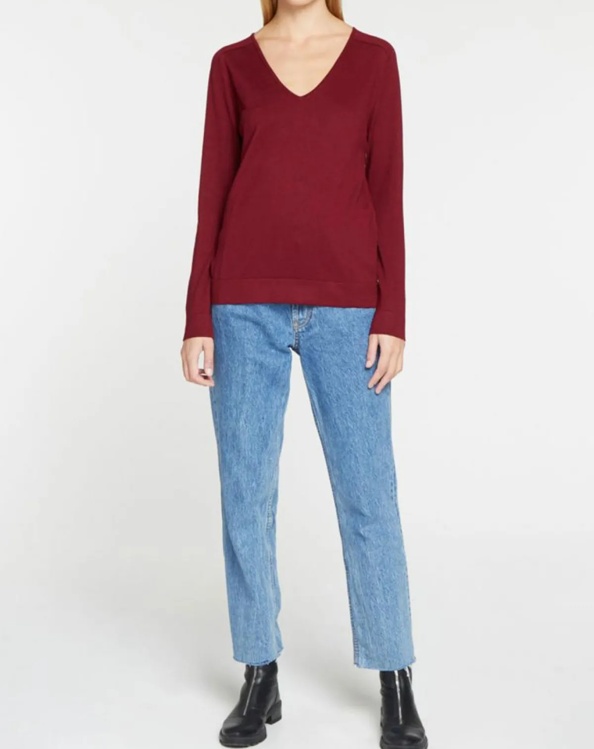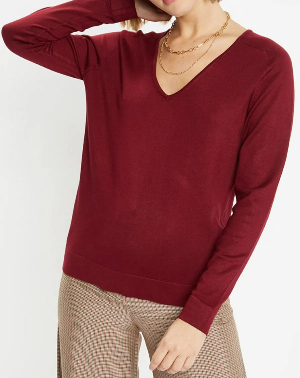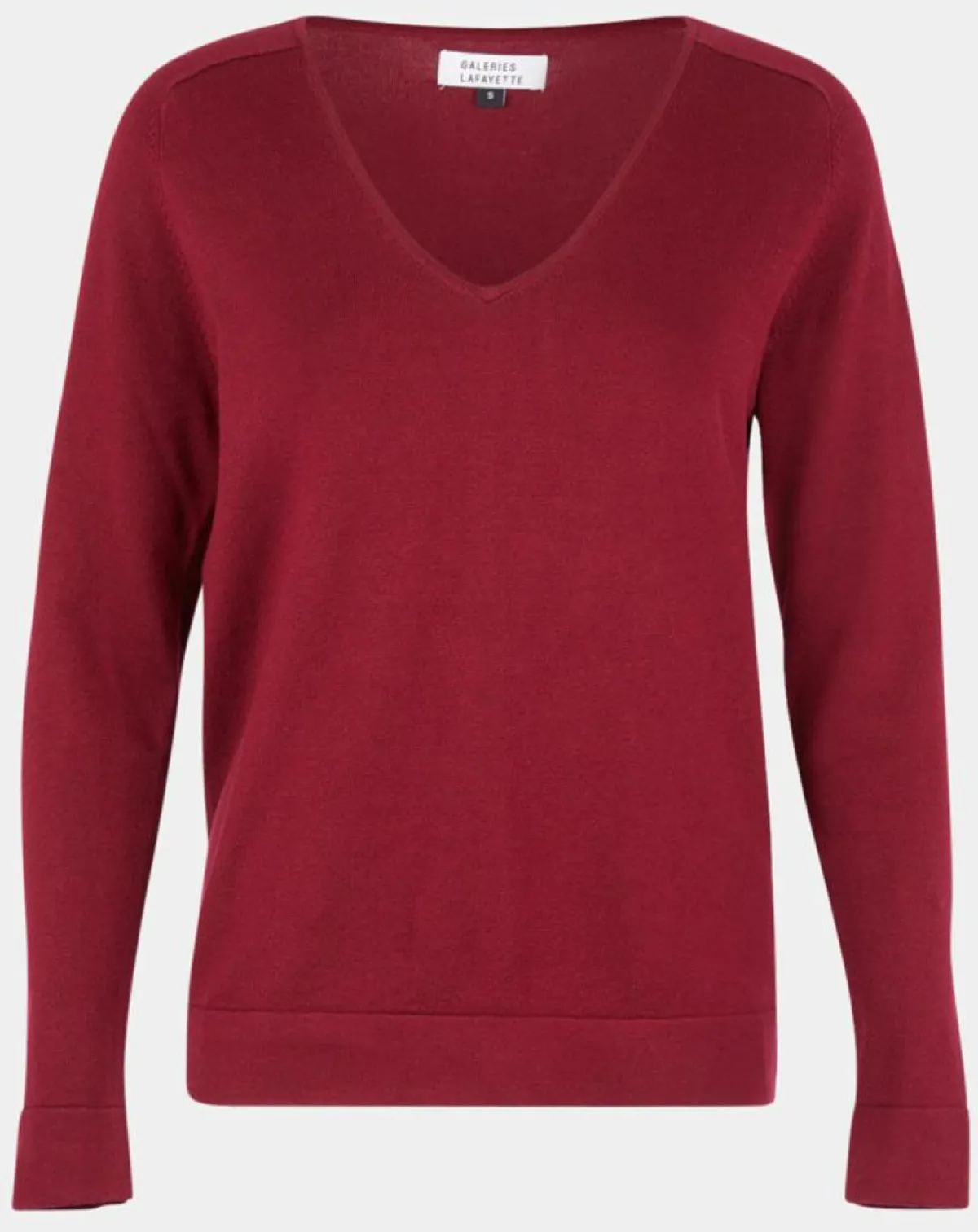 Ce pull droit Galeries Lafayette en maille fine, se pare d’un col V, de manches longues et de finitions côtelées.