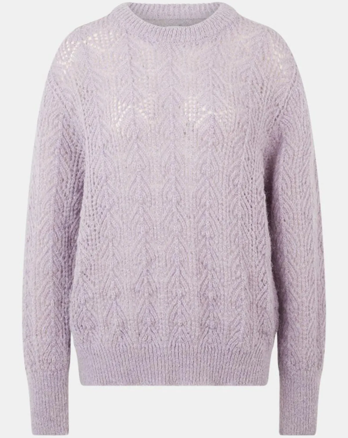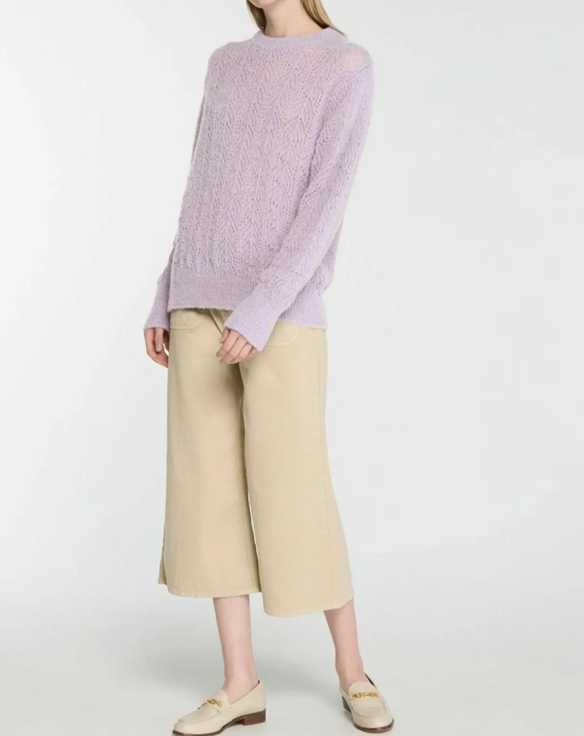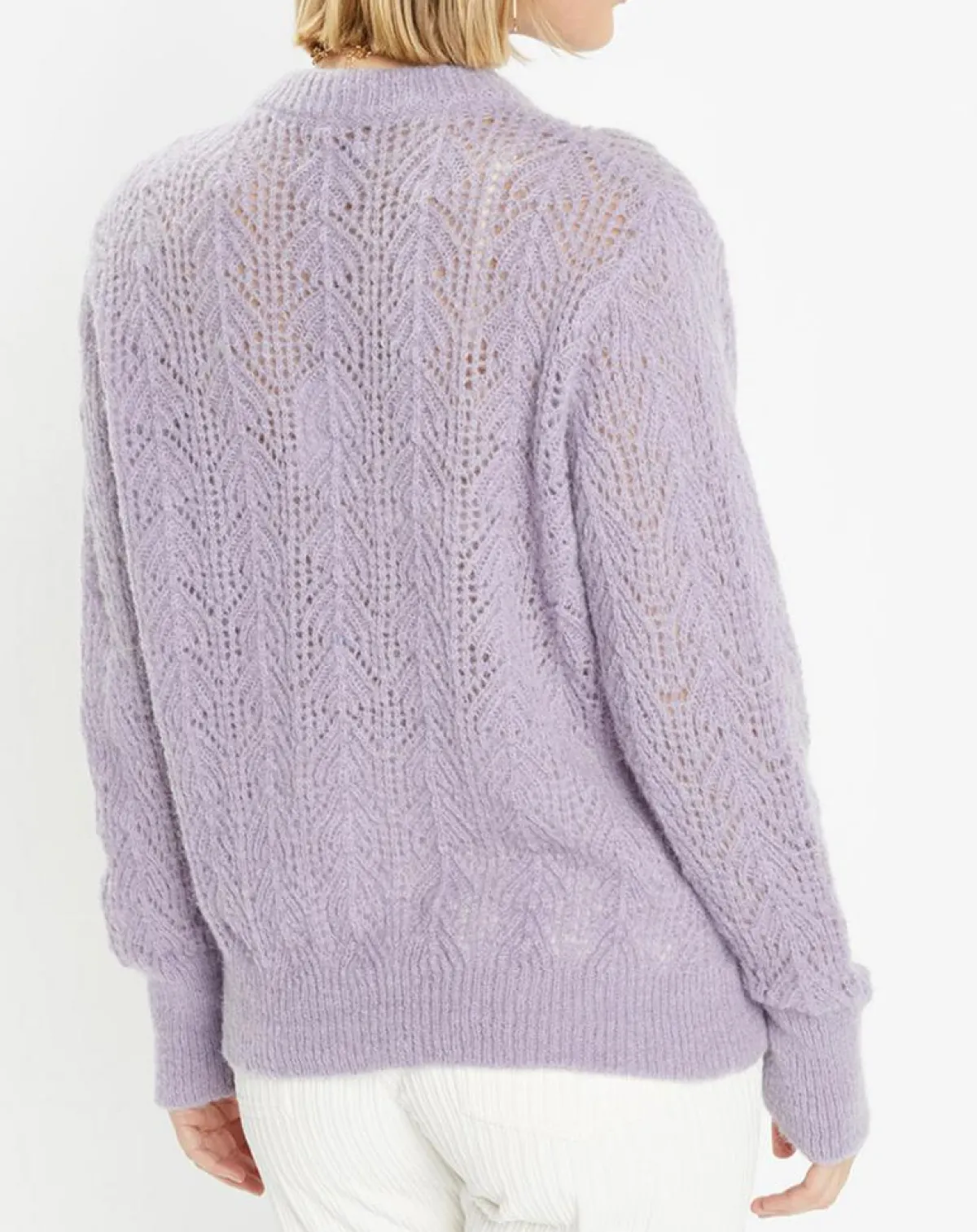 Ce pull droit Galeries Lafayette en maille pointelle mousseuse présente un col rond, des manches longues aux longs poignets ainsi que des finitions côtelées.