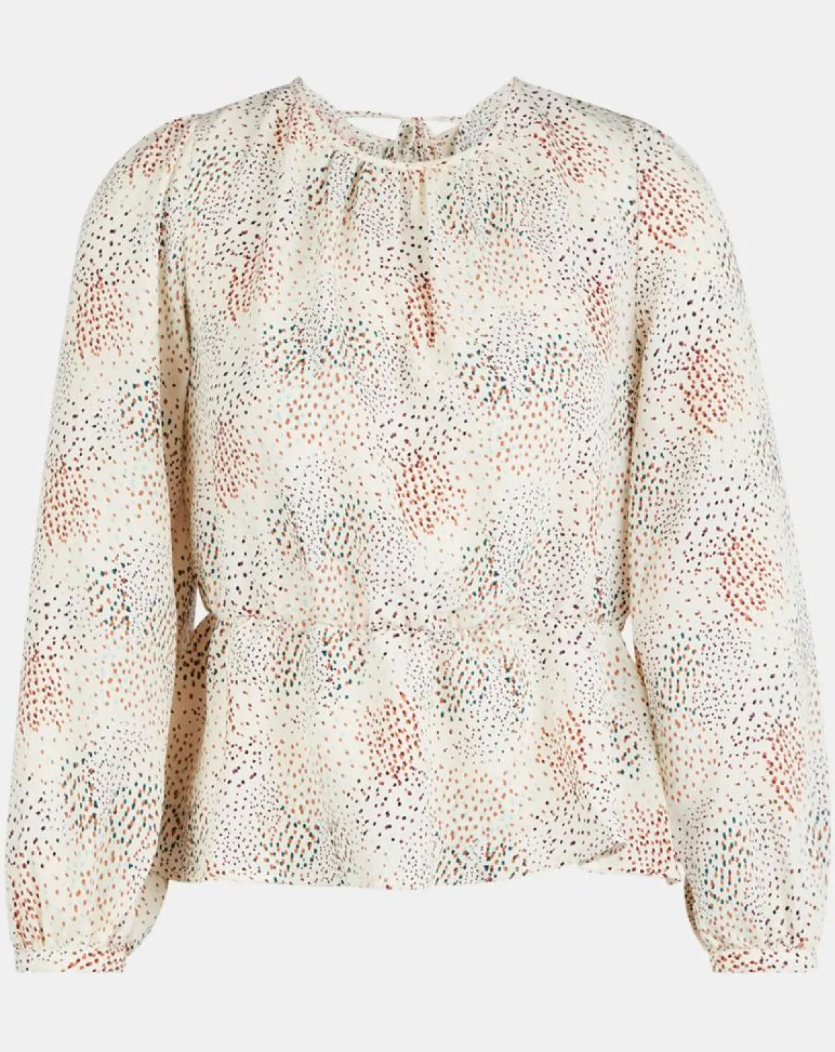 Cette blouse fluide Galeries Lafayette présente un imprimé moucheté, des manches longues, un col rond avant, un décolleté V au dos avec liens à nouer et une basque.