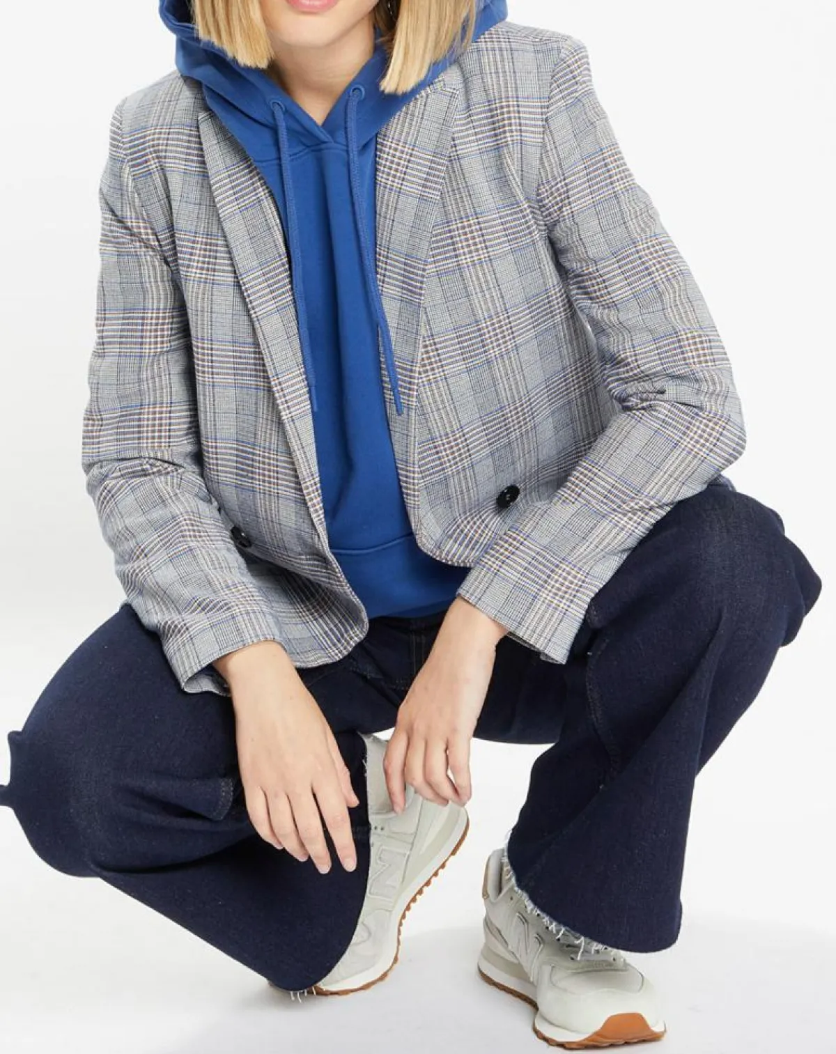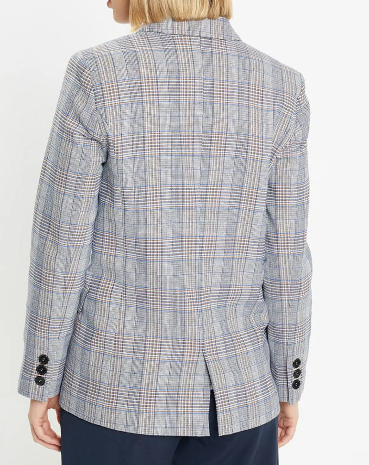 Cette veste blazer droite Galeries Lafayette présente un imprimé prince de galles, un col tailleur, un double boutonnage et des poches.