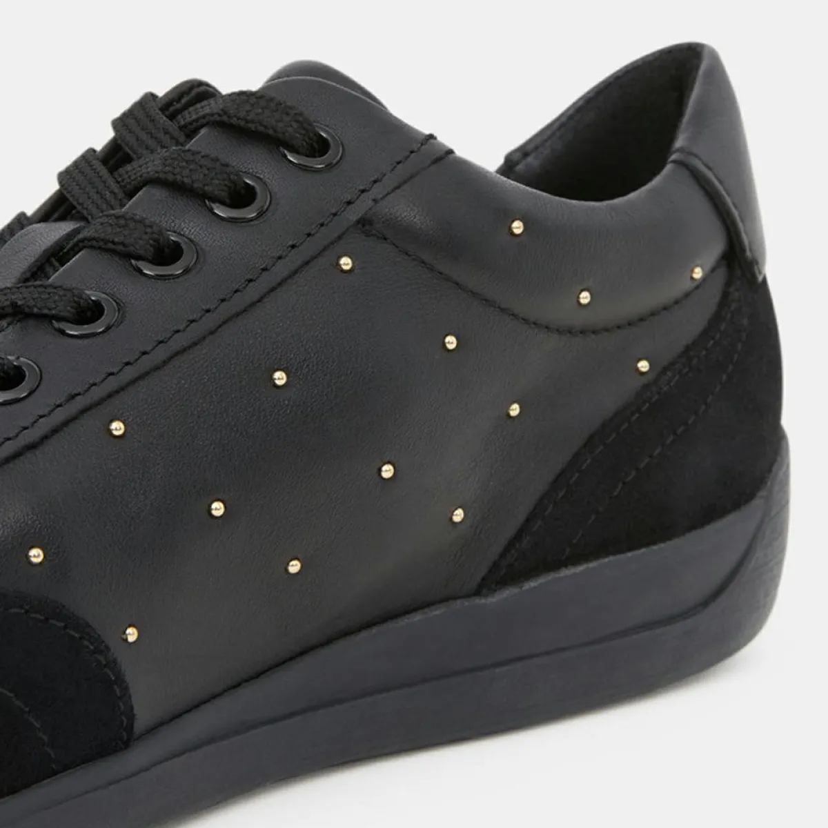 Ces baskets basses Geox confectionnées en cuir de vachette et suède, présentent des studs dorés décoratifs, 6 &oeligillets de laçage, une semelle intérieure respirante en cuir ainsi qu’une semelle extérieure en caoutchouc semi-perforé.