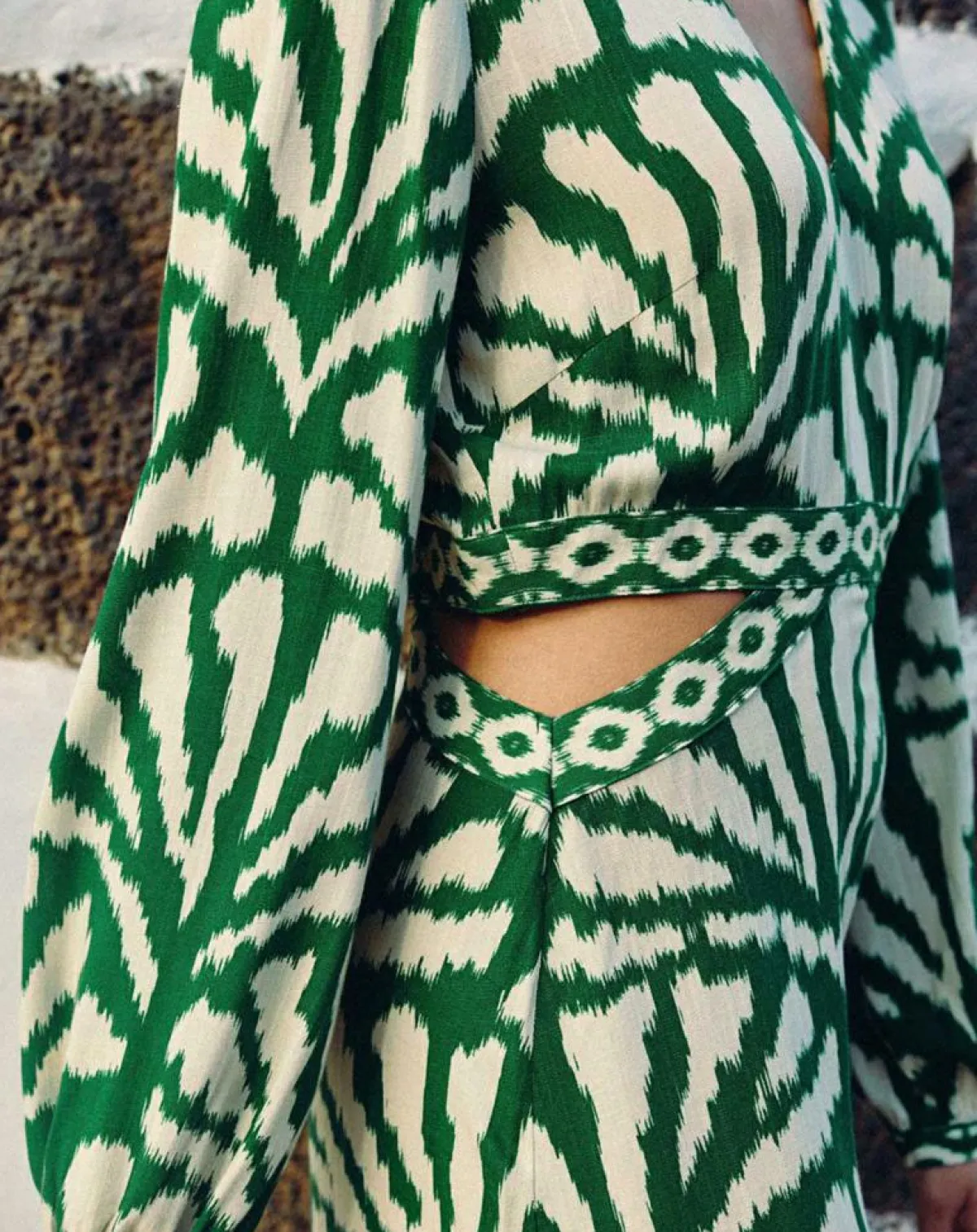 Elle présente une encolure en V, des manches longues et des découpes ajourées à la taille qui révèlent subtilement la silhouette.
