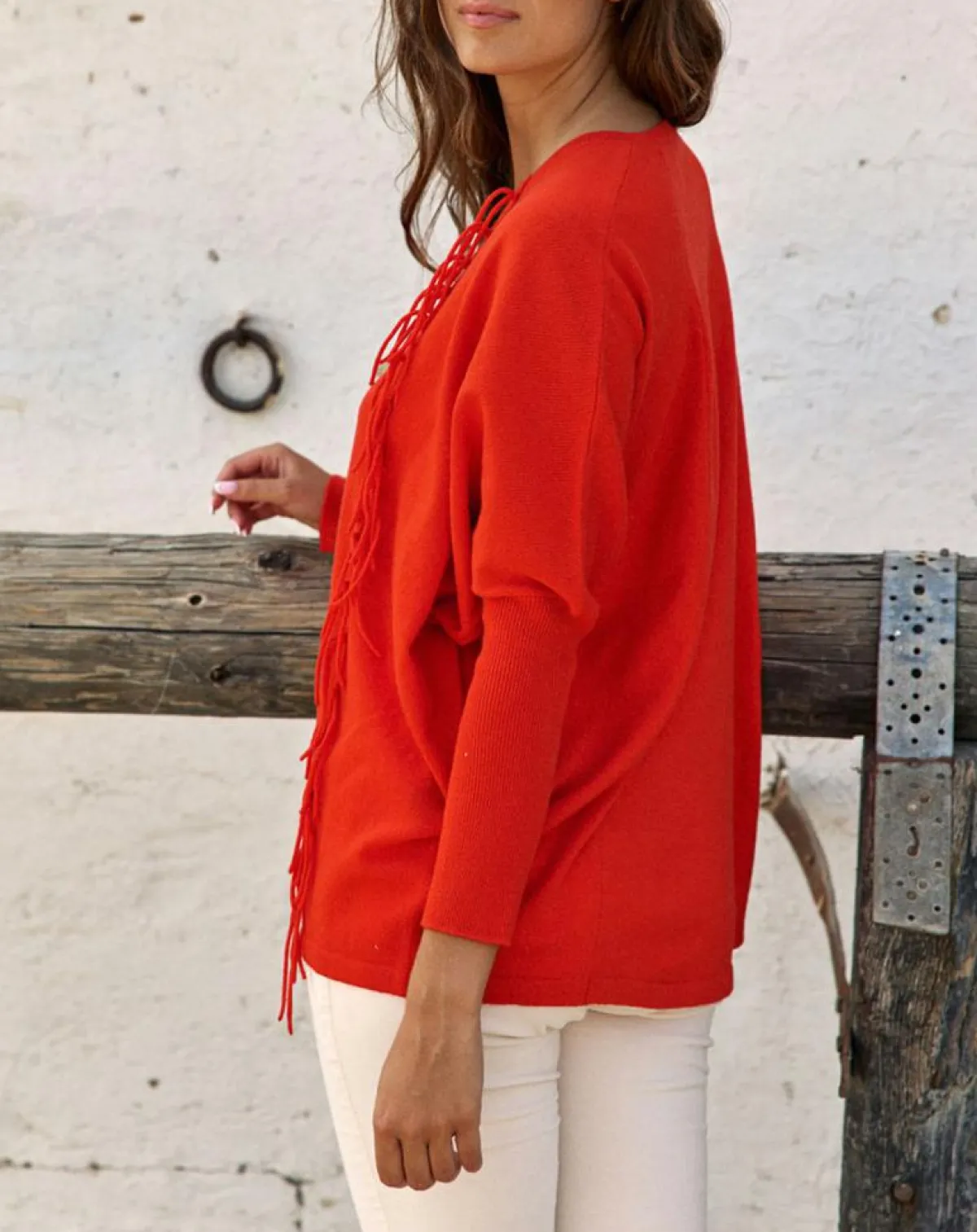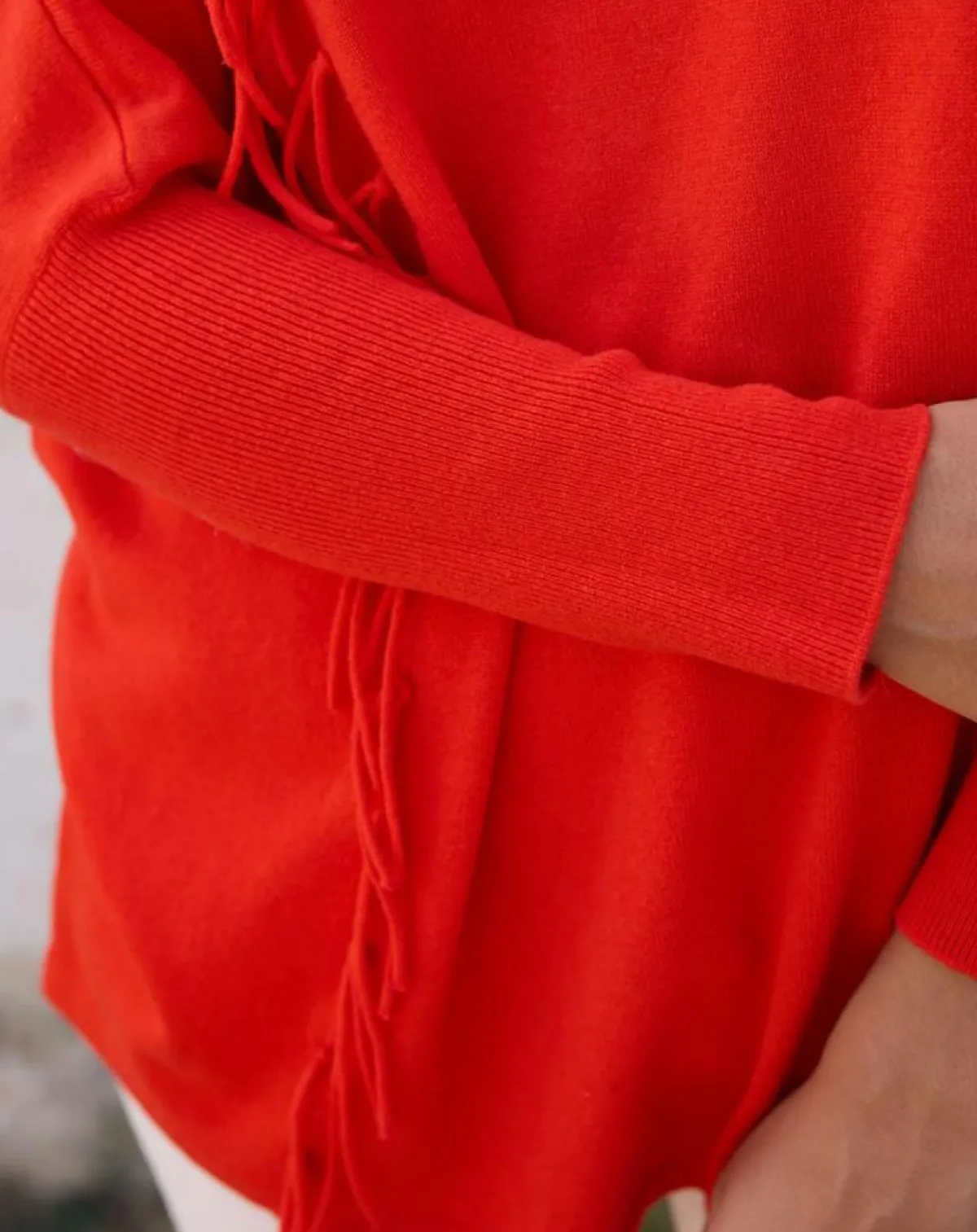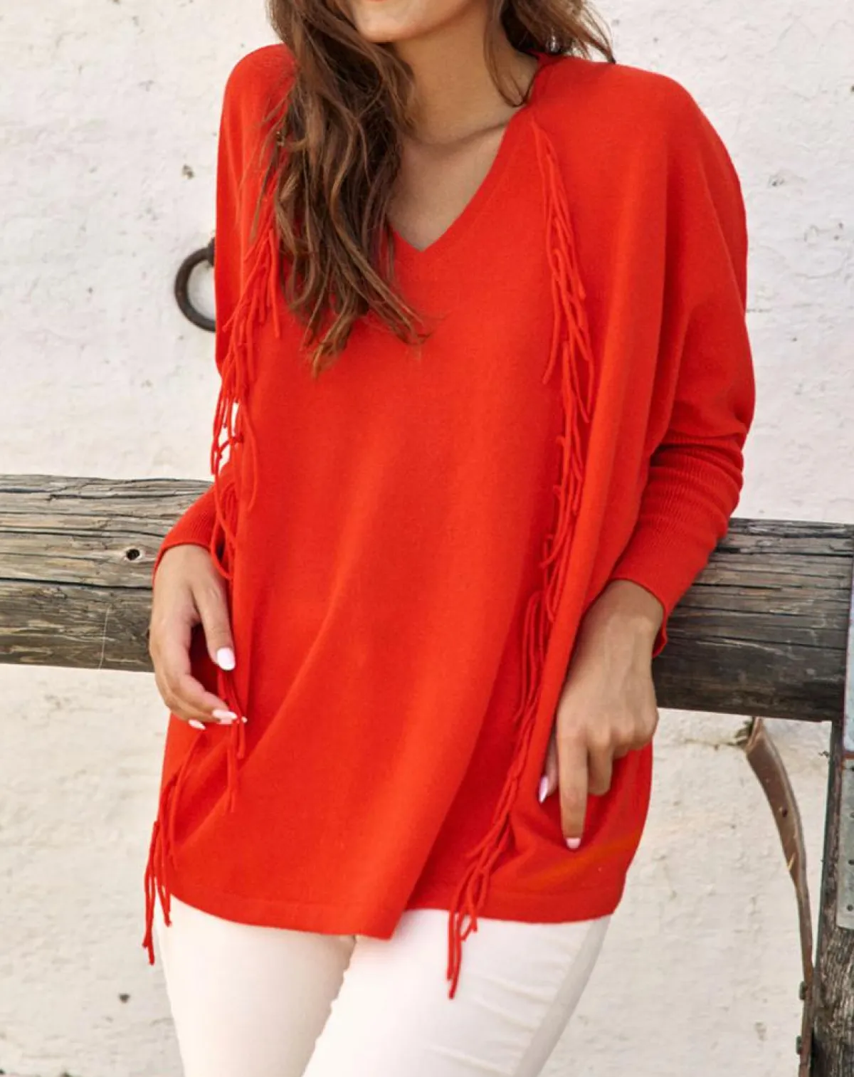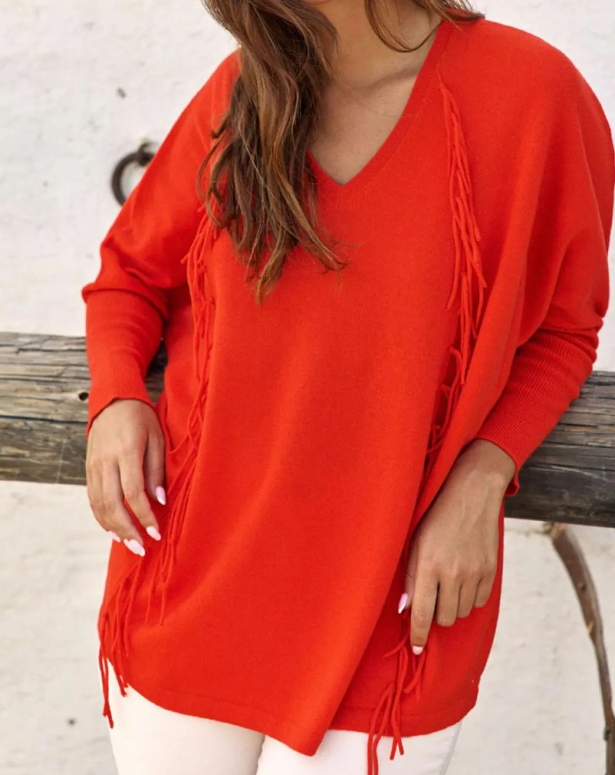 Pull frangé en 100% laine au col V et manches longues
