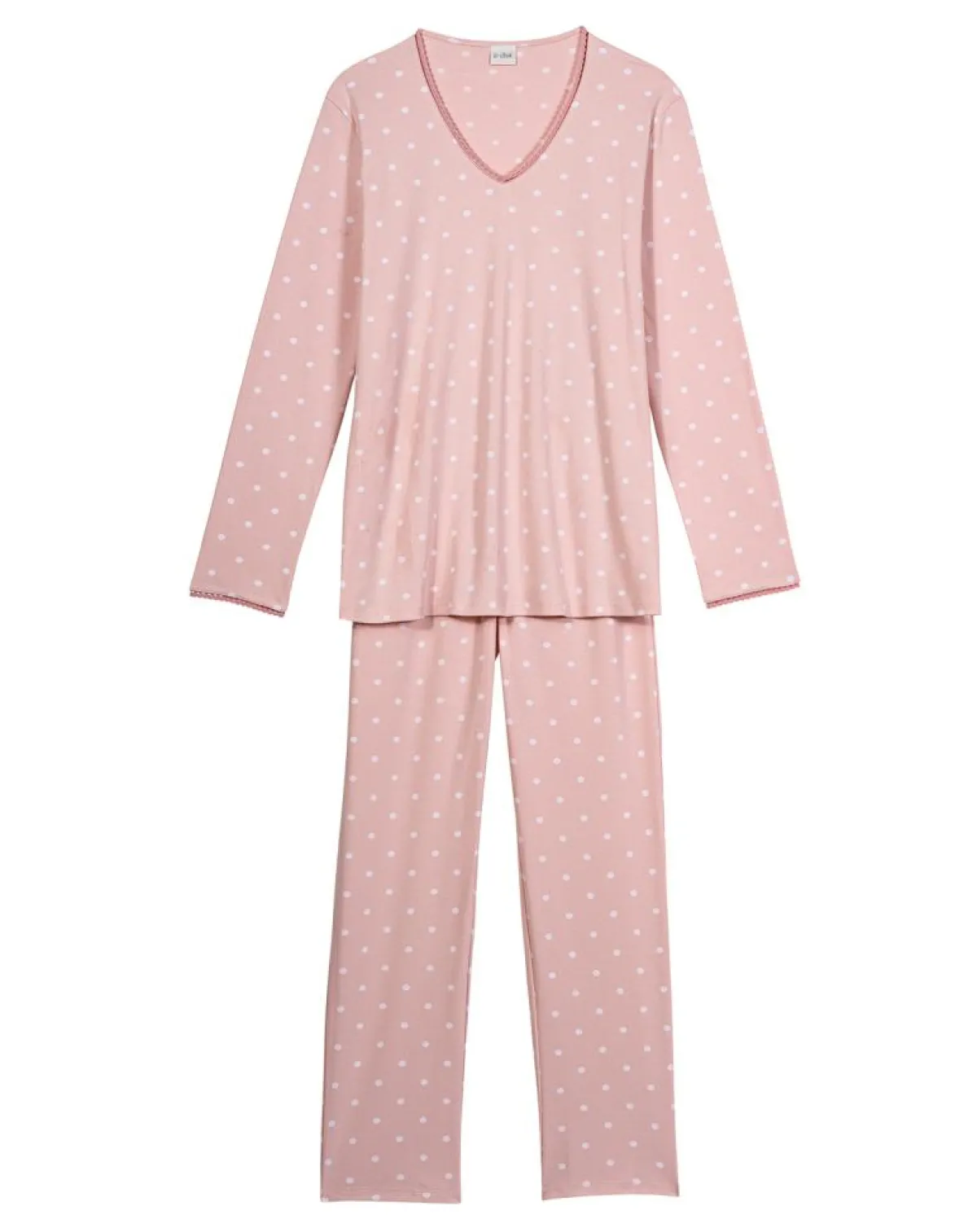L’imprimé à pois écru, un basique incontournable, est ici décliné sur trois variantes de fond faciles à assortir : rose poudré, bleu de Prusse et gris chiné.