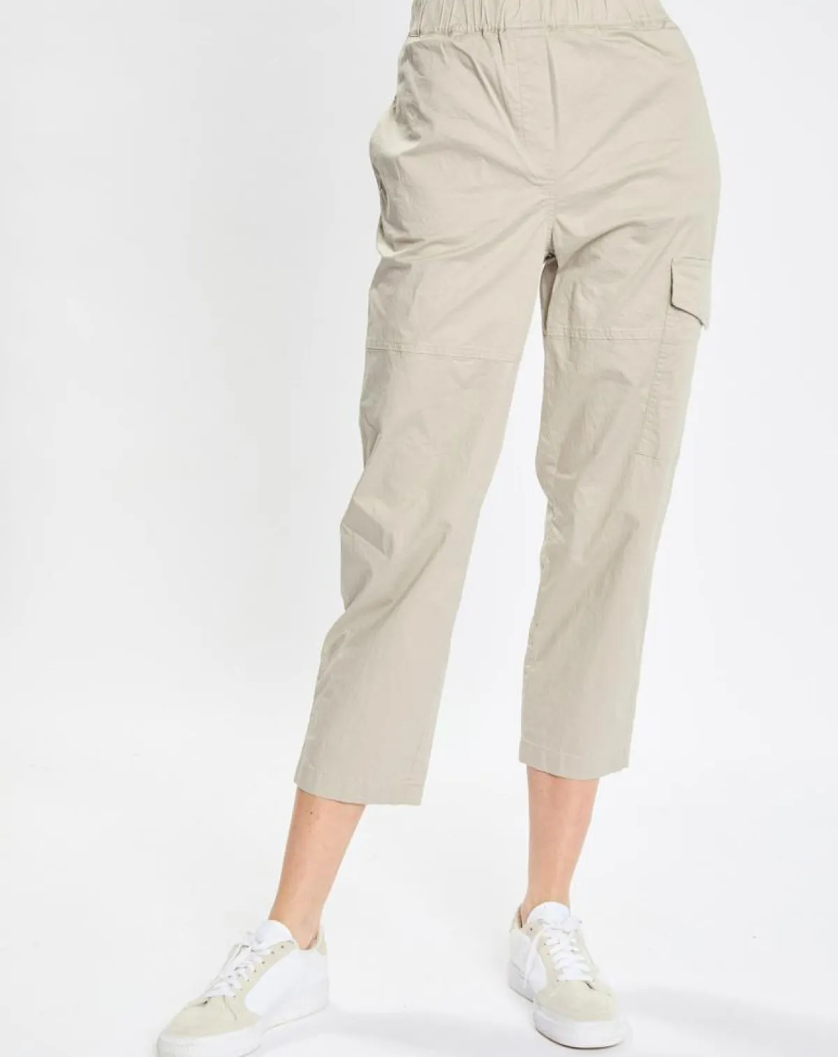 Modèle avec ceinture caractéristique et élastique, poches fendues pratiques, prises dans la couture sur les côtés, poches passepoilées sur le fessier et une grande poche cargo plaquée d’un côté.