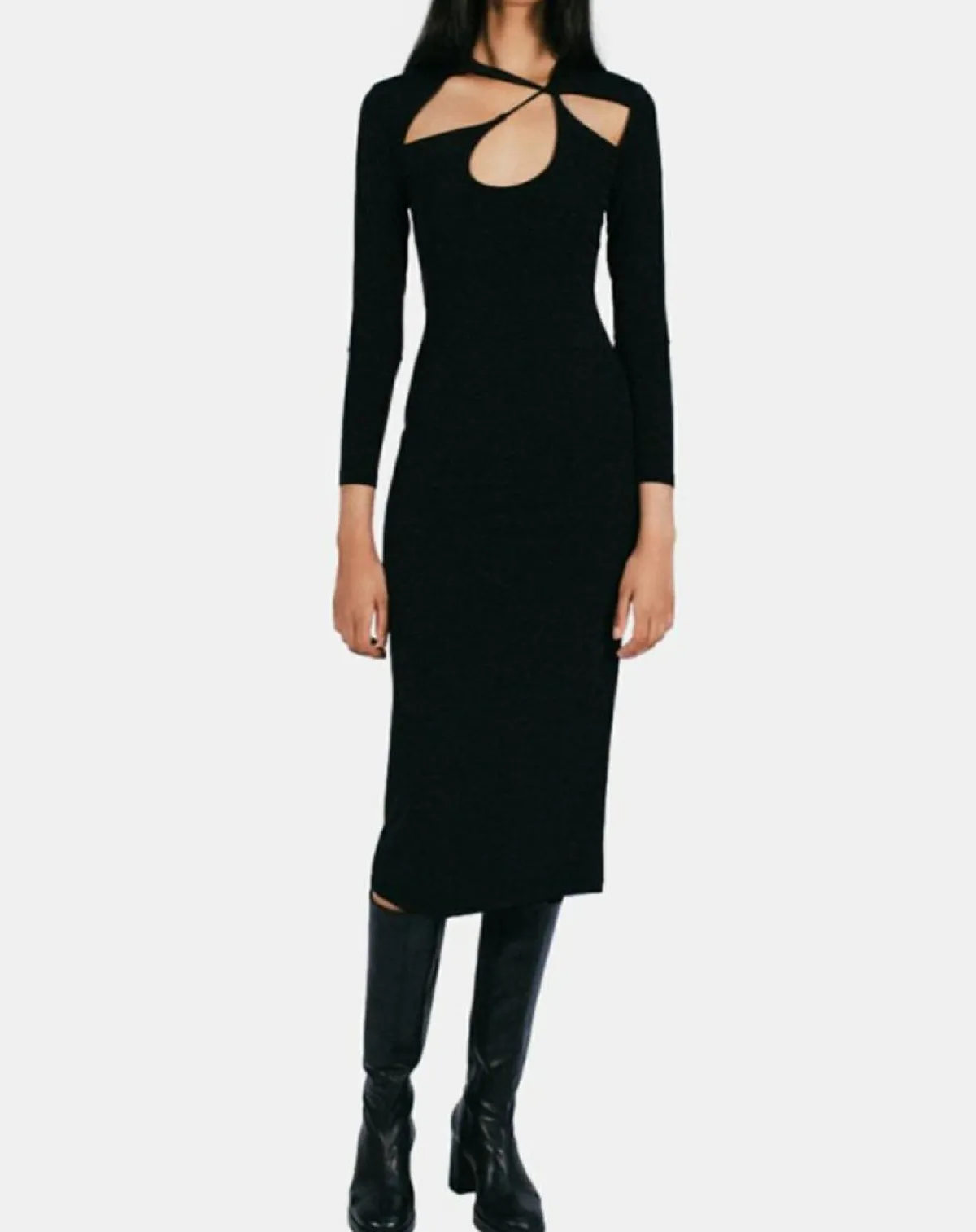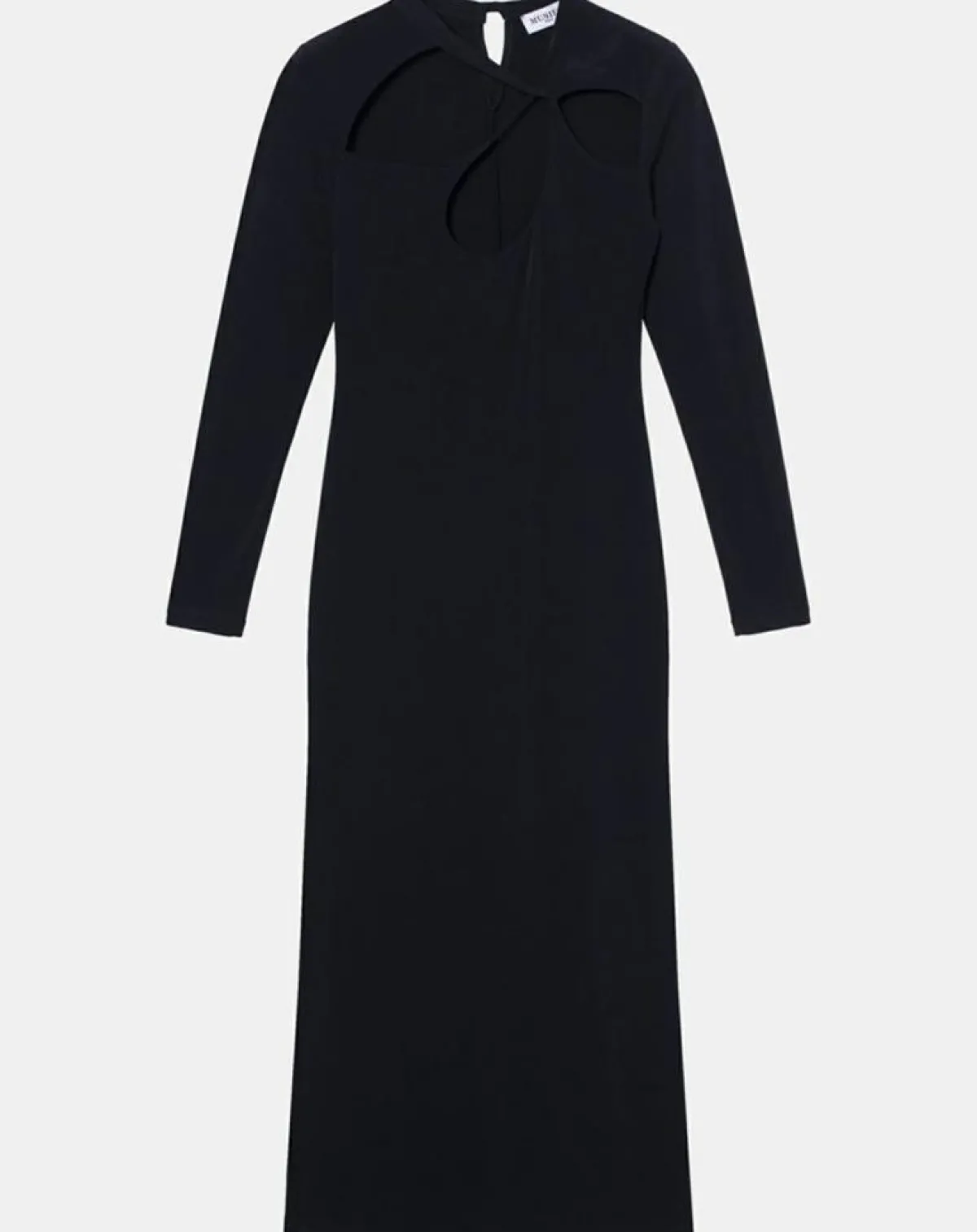 Cette robe longue Musier séduit par sa coupe asymétrique et ses découpes au niveau du décolleté.