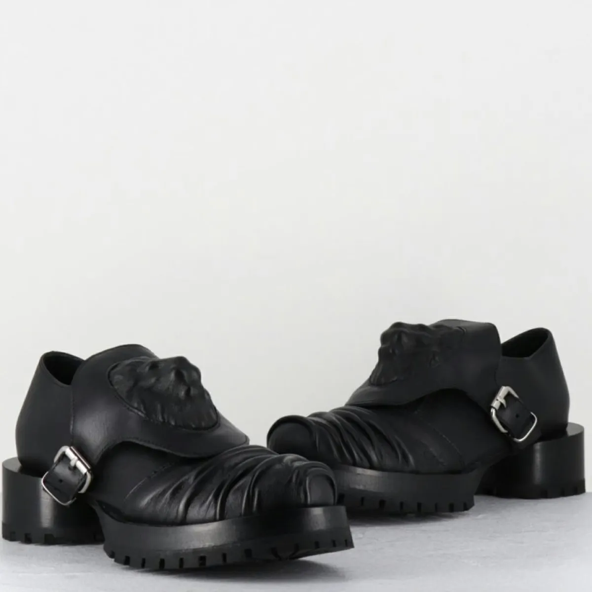 Chaussures derbies en cuir noir ornées d’un écusson à tête de lion esprit surréaliste qui se fixe à l’aide d’une petite boucle sur le côté