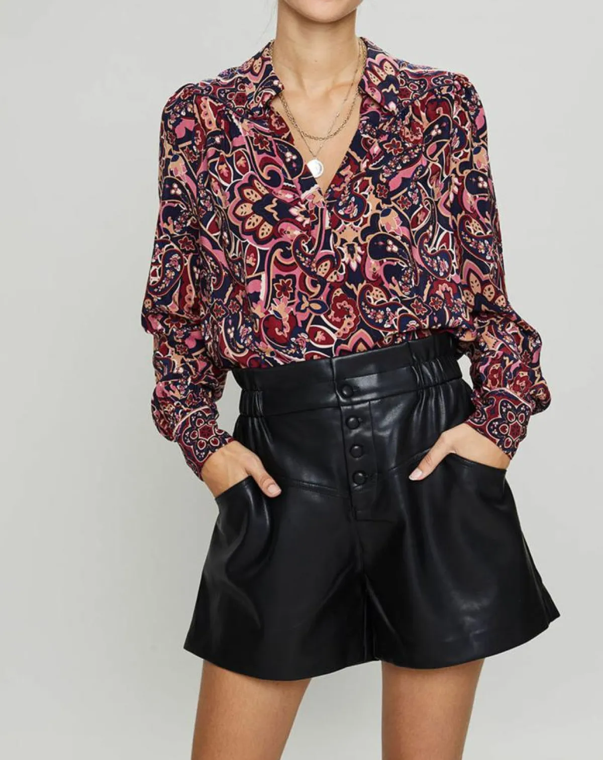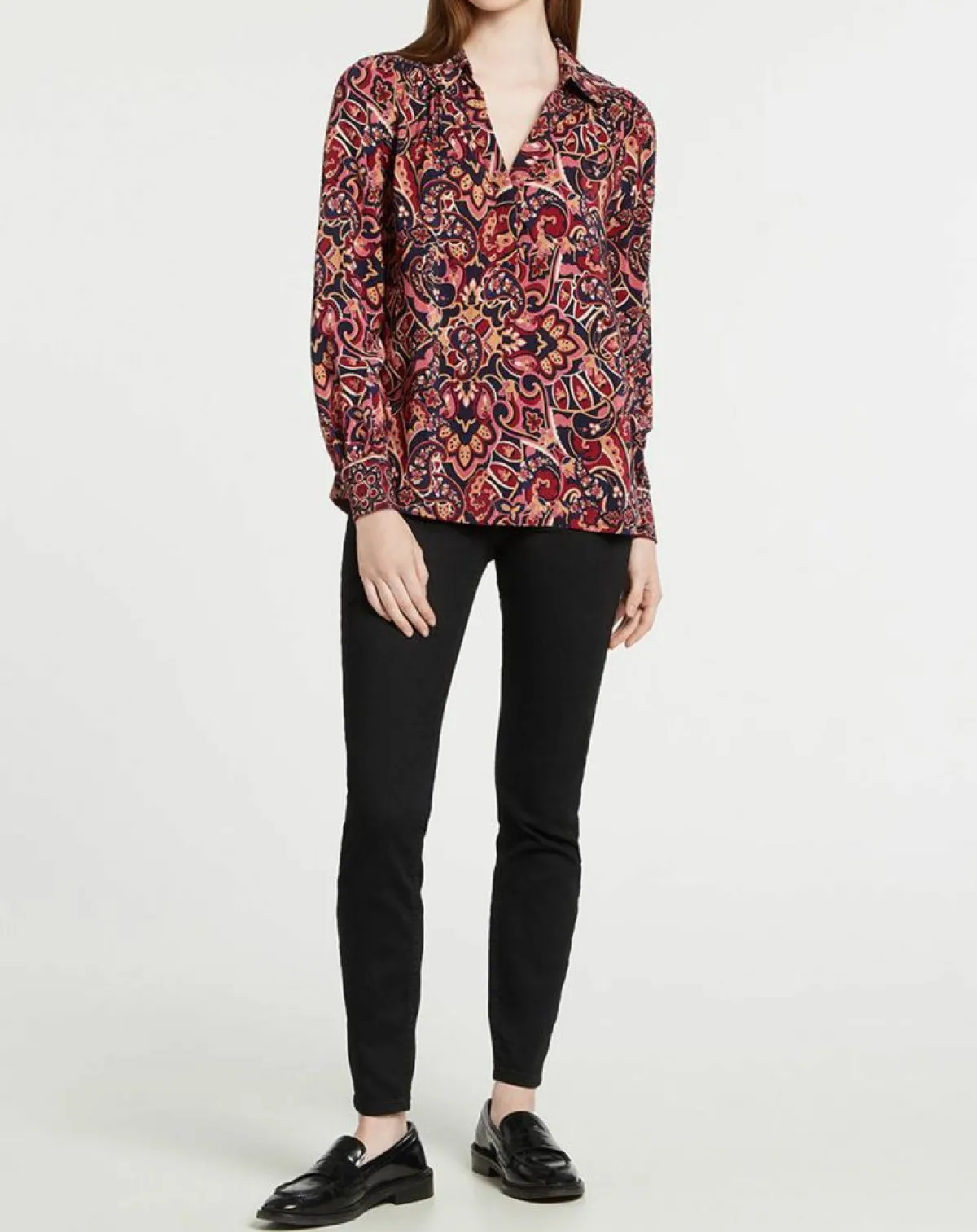 Cette blouse droite fluide fantaisie Suncoo est dotée d’un col classique suivi d’un décolleté V, de manches longues et de poignets resserrés.