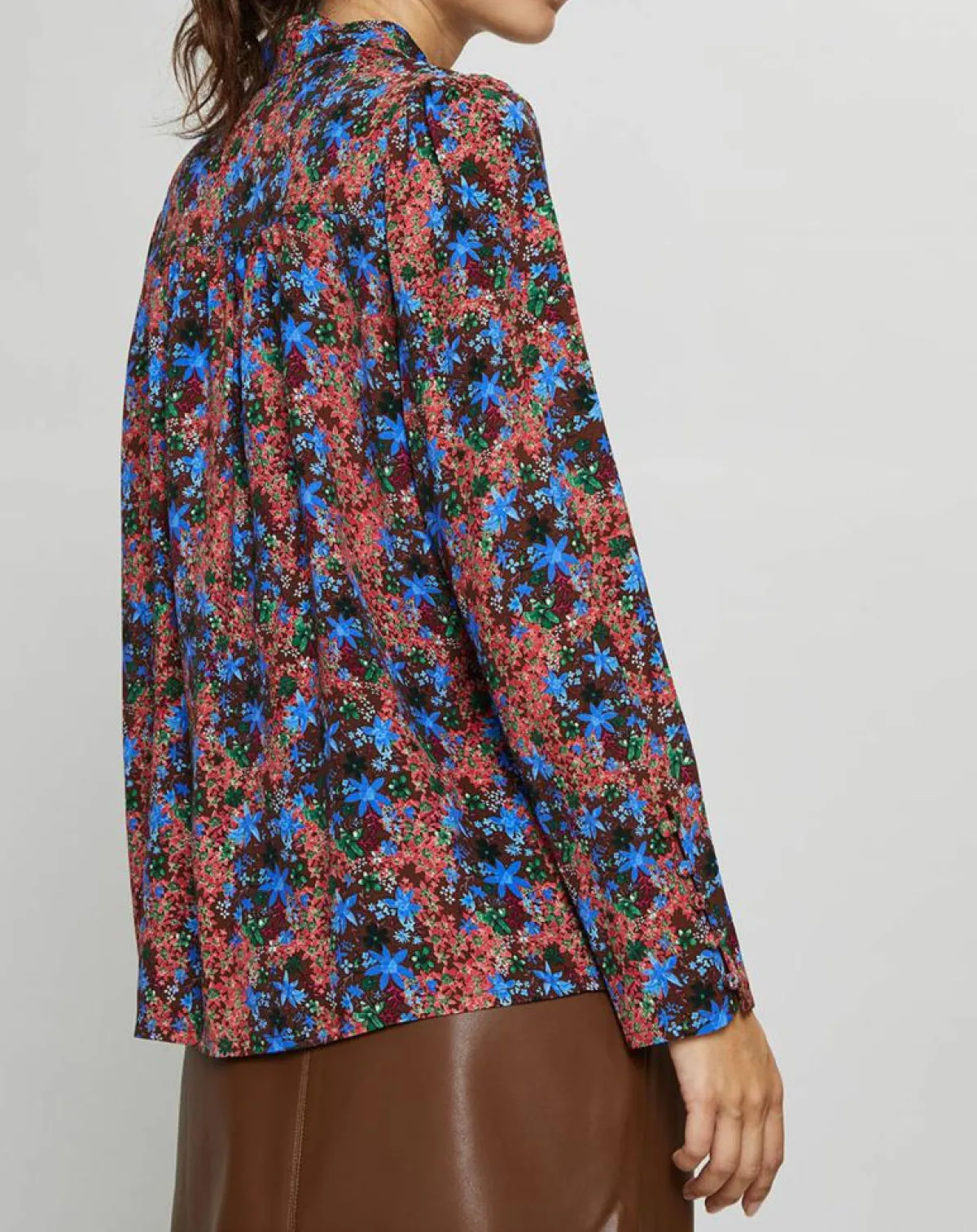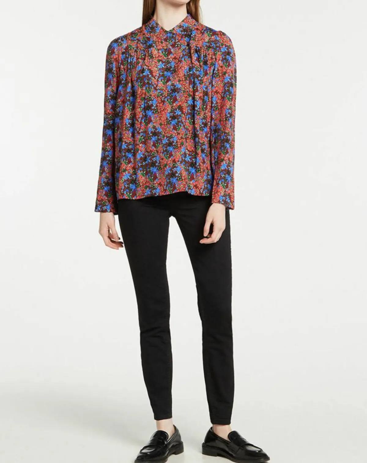 Cette blouse droite fluide fleurie Suncoo est munie d’un petit col V croisé fermé par un bouton, de manches longues et de fronces sur la poitrine.
