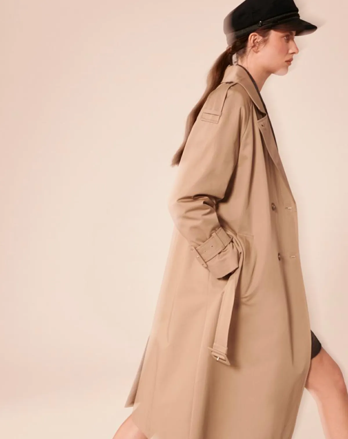Pièce idéale et intemporelle de la mi-saison, ce trench beige en gabardine de coton reprend tous les codes classiques du trench avec son col à revers, sa fermeture à double boutonnage, ses boutons écaille mats et sa ceinture ton sur ton