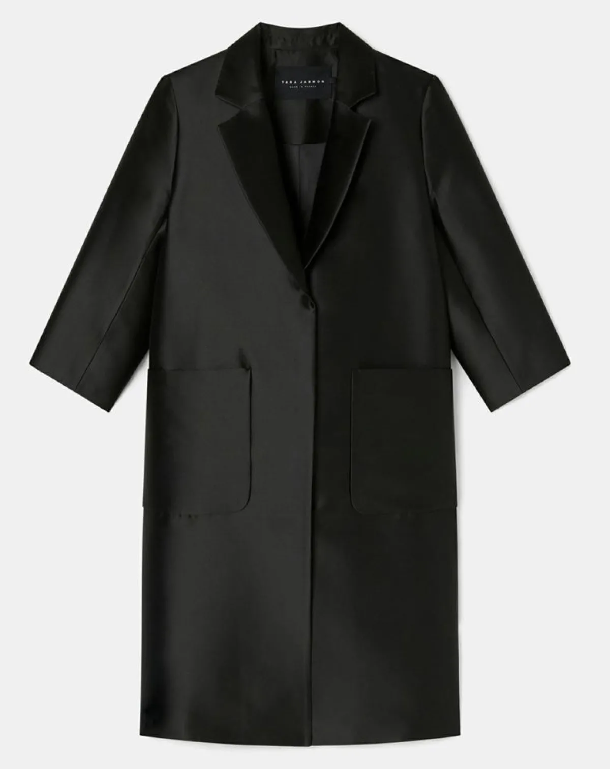 Ce long manteau noir en satin duchesse possède une coupe droite et large, un col à revers, des manches 3/4 et deux grandes poches plaquées aux côtés