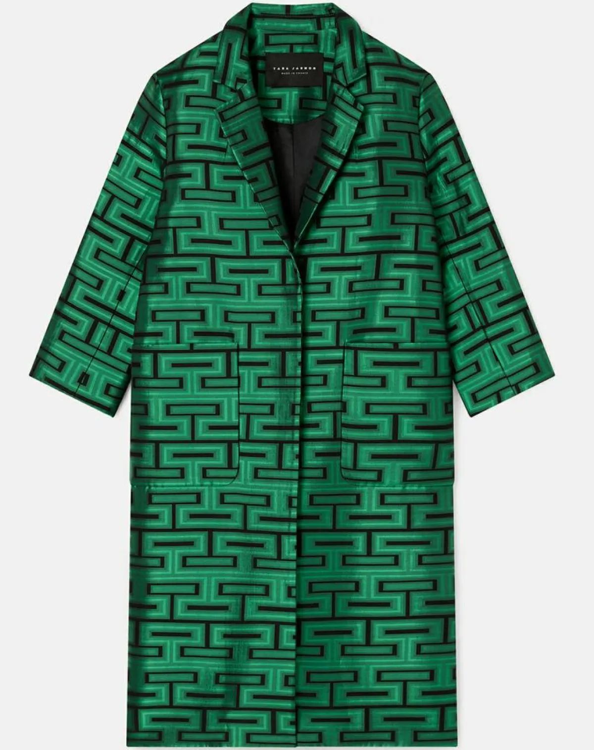 Ce long manteau vert imprimé graphique possède une coupe droite et large, un col à revers, des manches 3/4 et deux grandes poches plaquées aux côtés