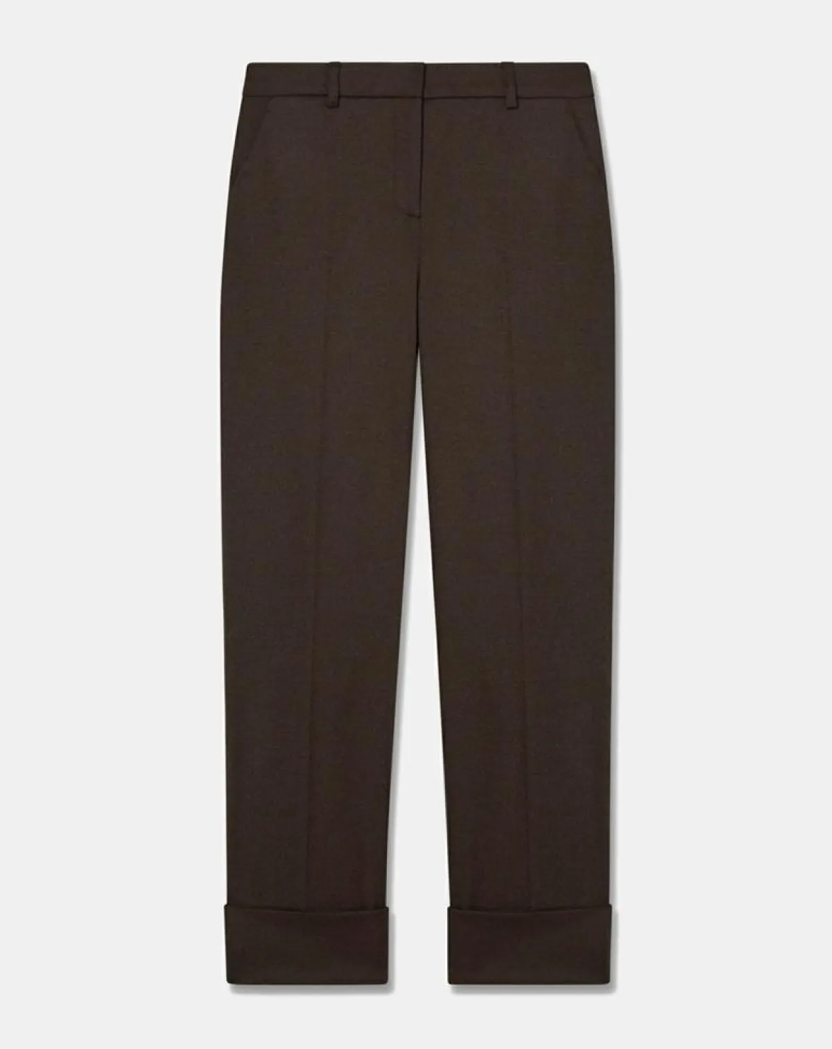 Basique de la garde-robe, ce pantalon de tailleur en flanelle couleur chocolat possède une coupe courte soulignée d’un large revers, une taille mi-haute, des plis plats et des passants pour ceinture.
