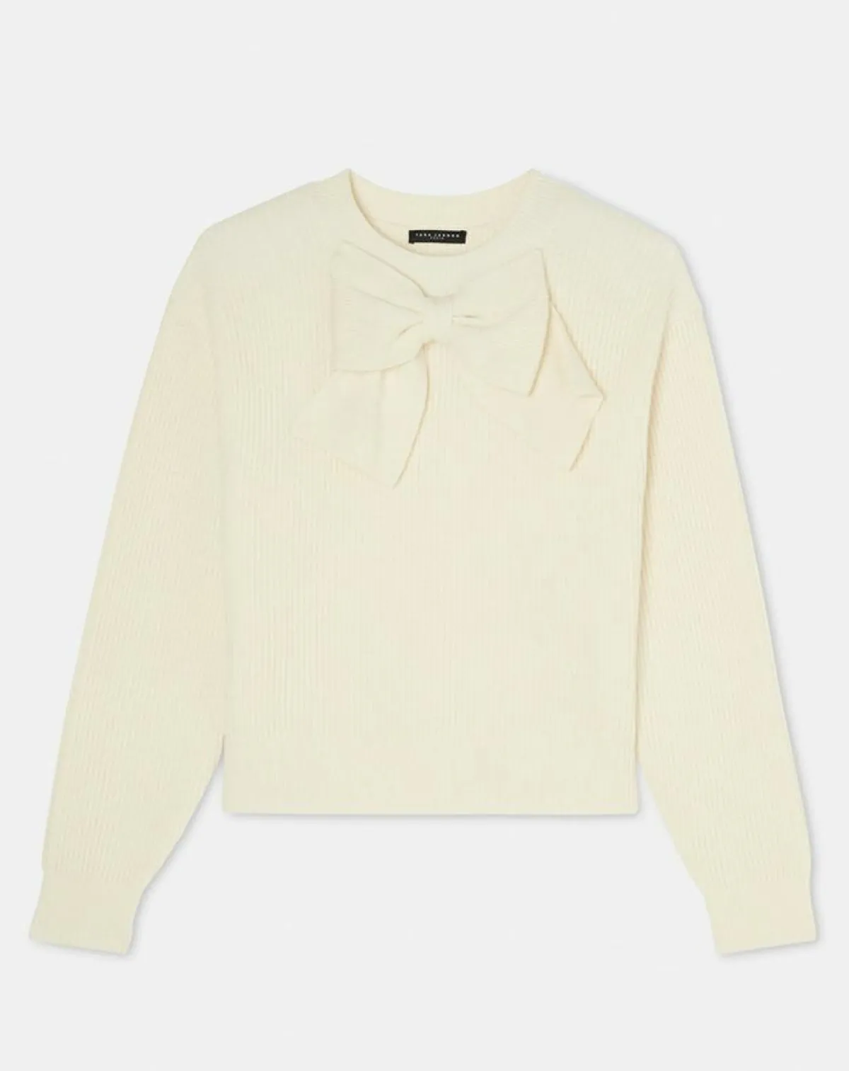 Ce pull en laine écru côtelé possède une encolure ronde et des manches longues