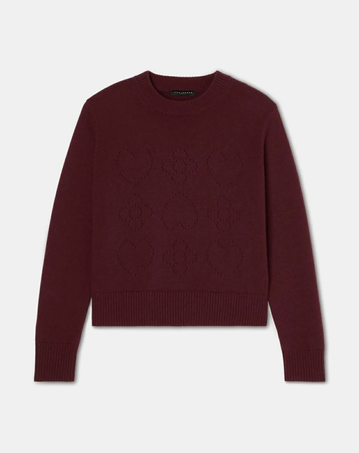 Des surpiqures décorent l’avant du pull formant des fleurs et des curs, so Tara.