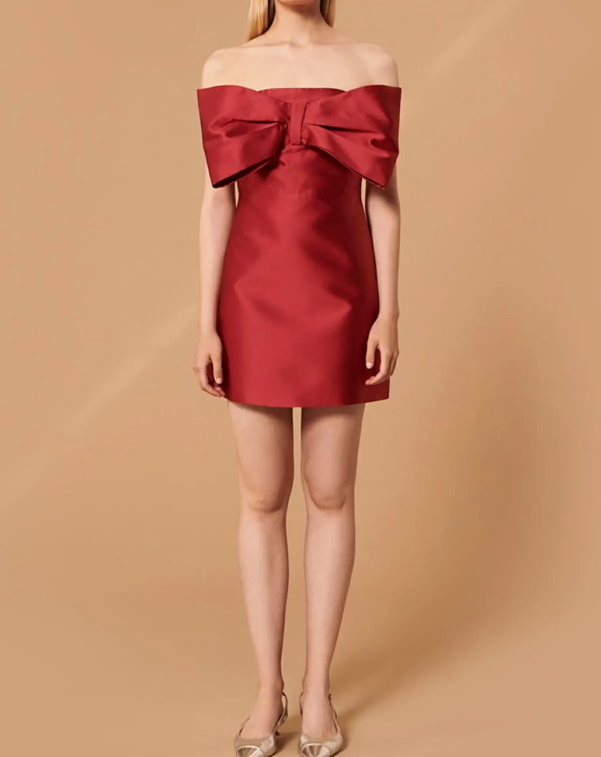 Cette robe bustier en satin duchesse de couleur rouge est décorée d’un gros noeud à la poitrine