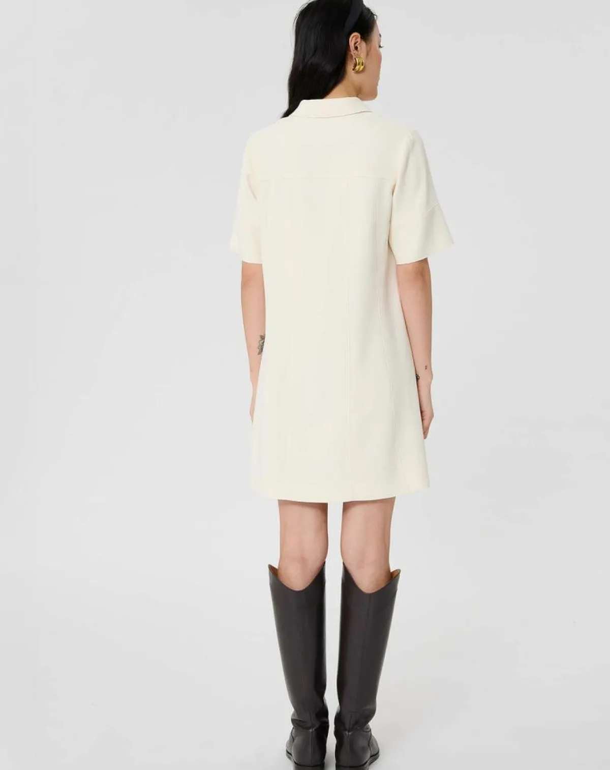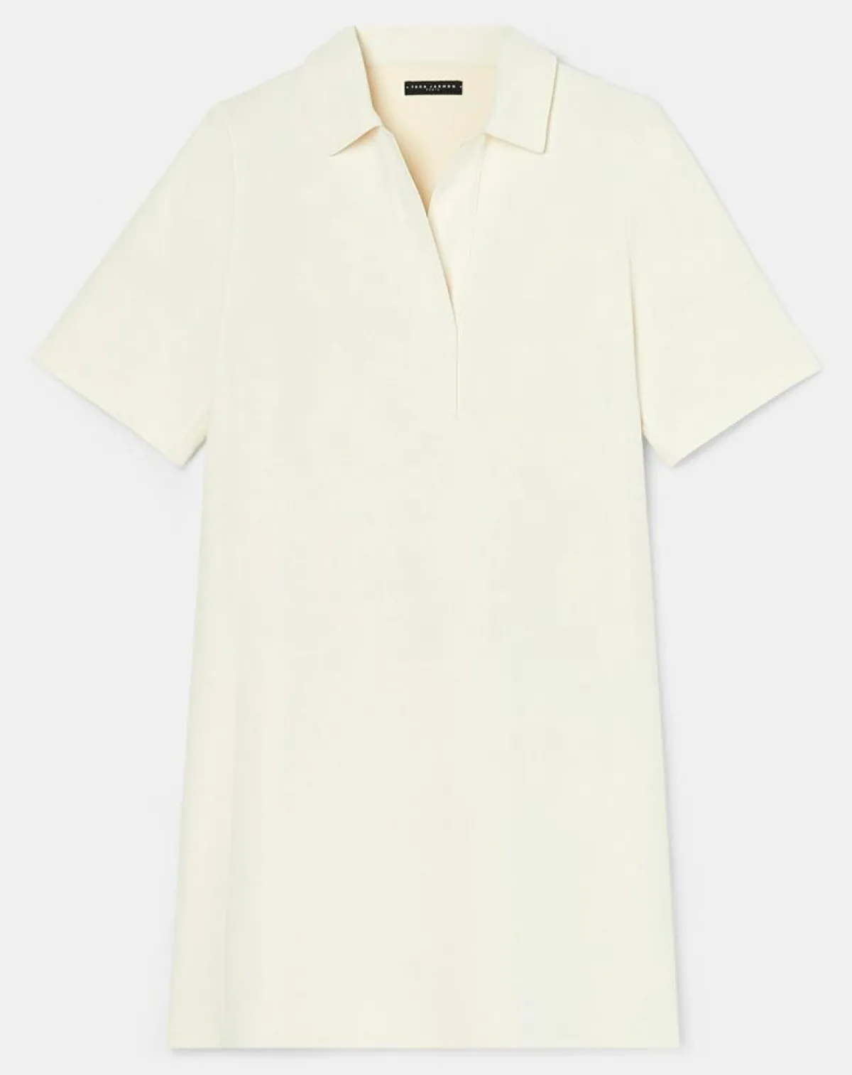 Cette courte robe écrue en crêpe possède une coupe légèrement évasée, des manches courtes, ainsi qu’un col chemise et une encolure en V.