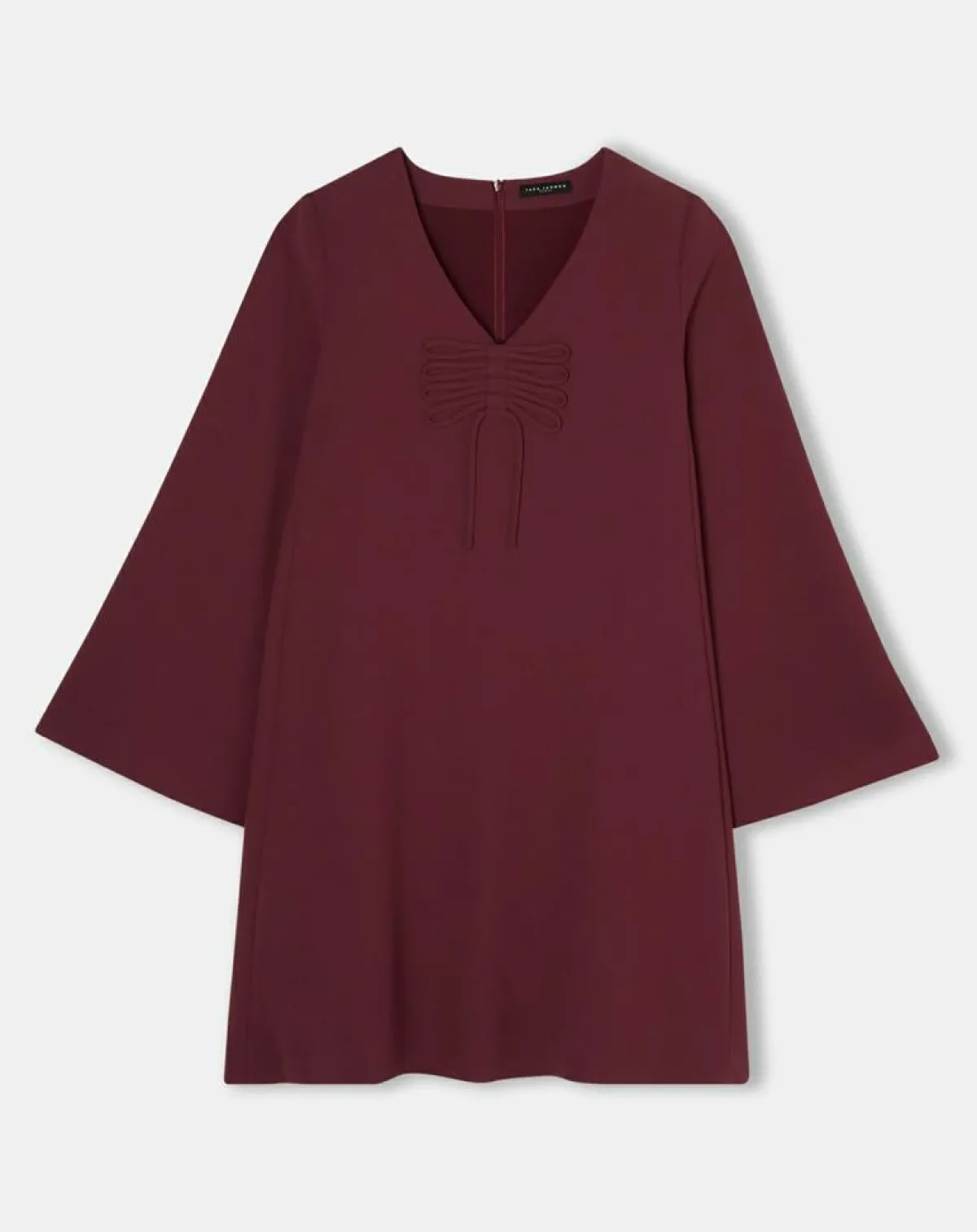 Cette robe bordeaux en crêpe possède une coupe droite, un col V et des manches longues et larges