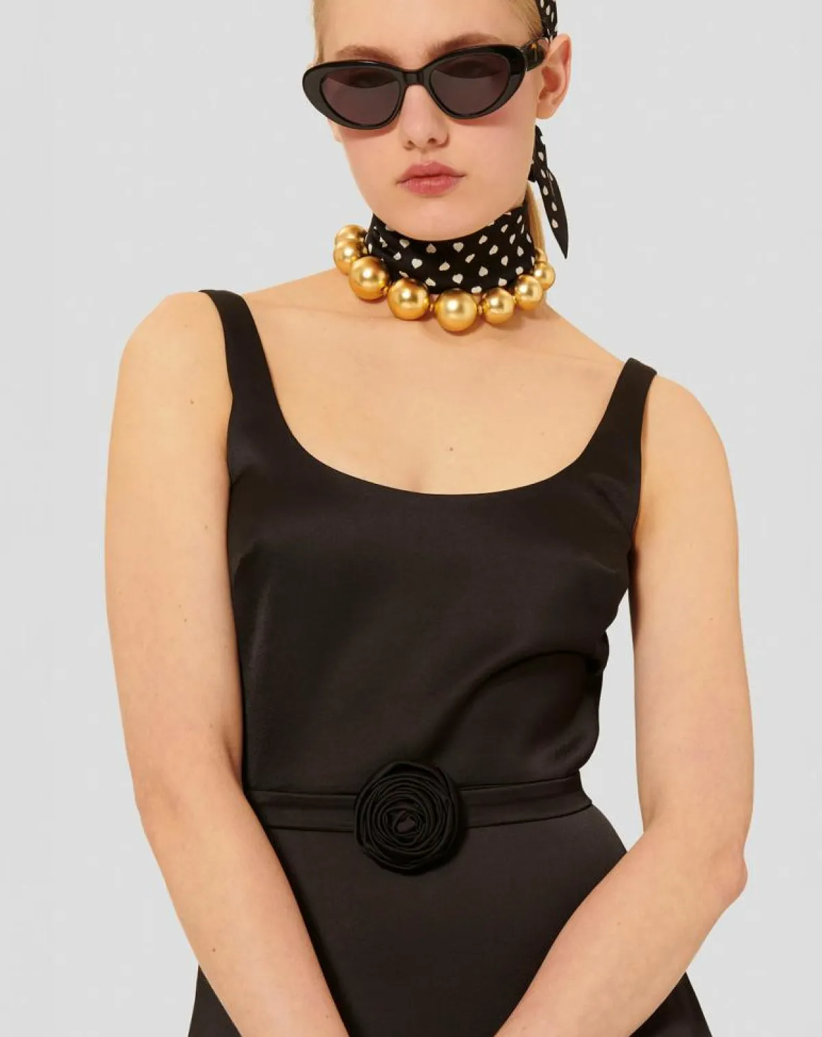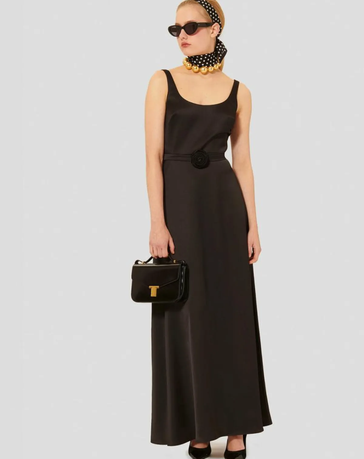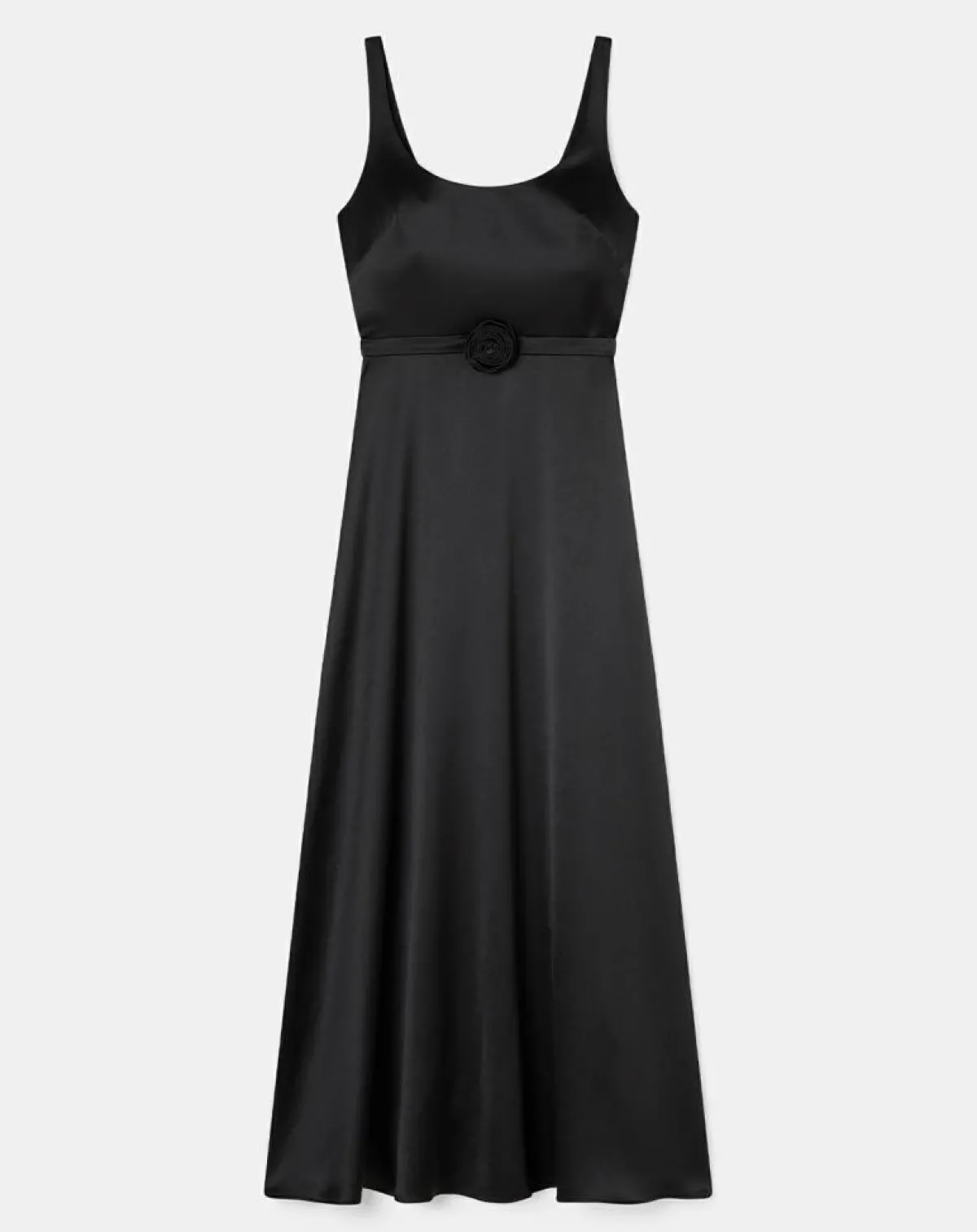 Cette robe noire en satin fluide est sans manches et possède une encolure ronde, une jupe droite et est cintrée à la taille