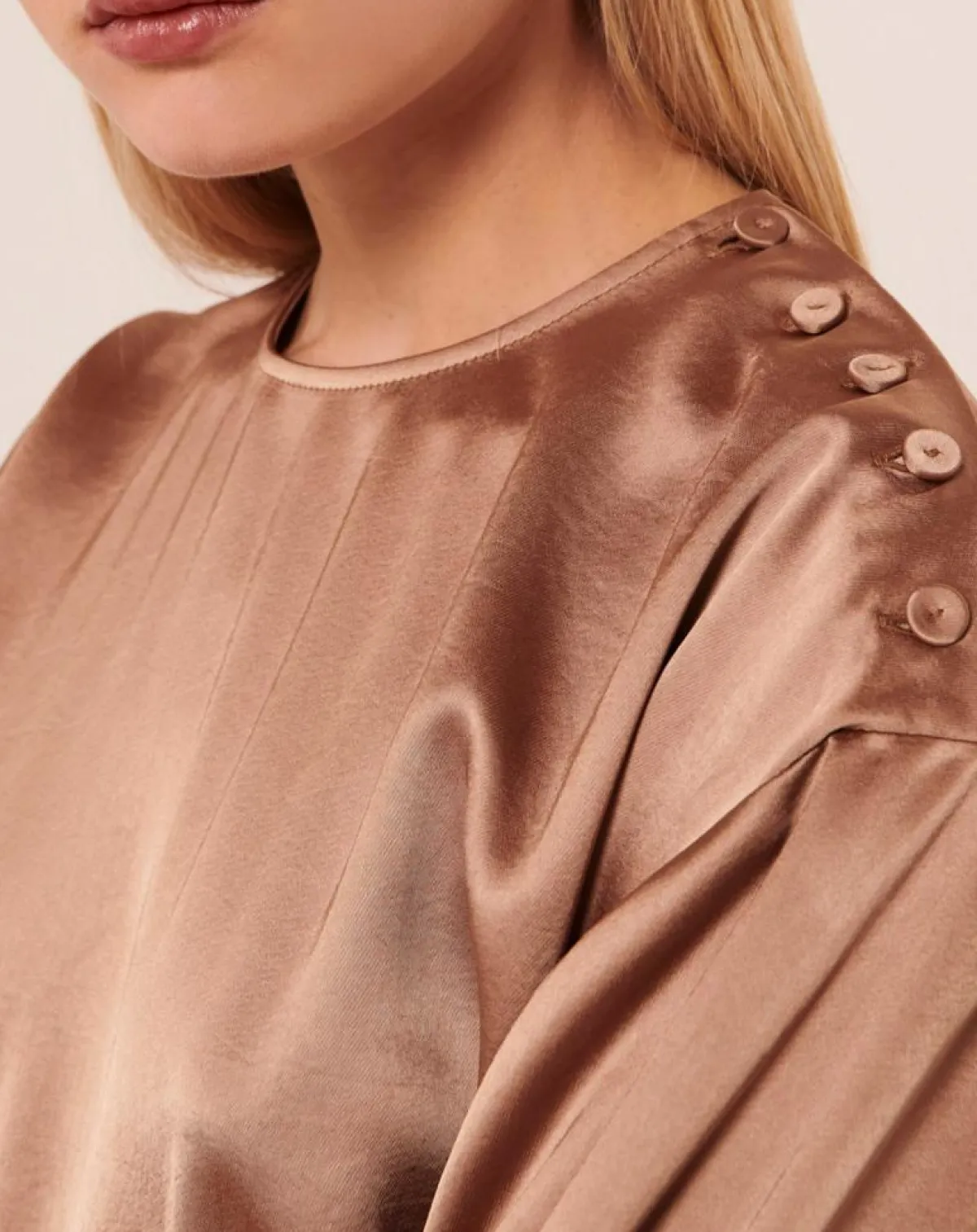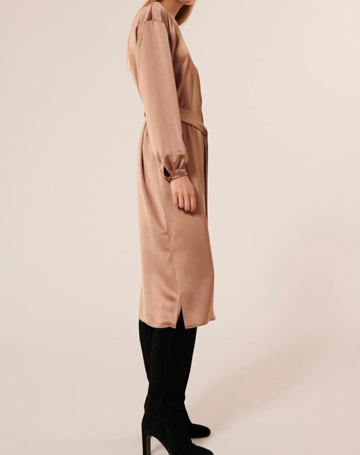Cette robe longue couleur mordoré en satin fluide possède un col rond et des manches longues boutonnées aux poignets