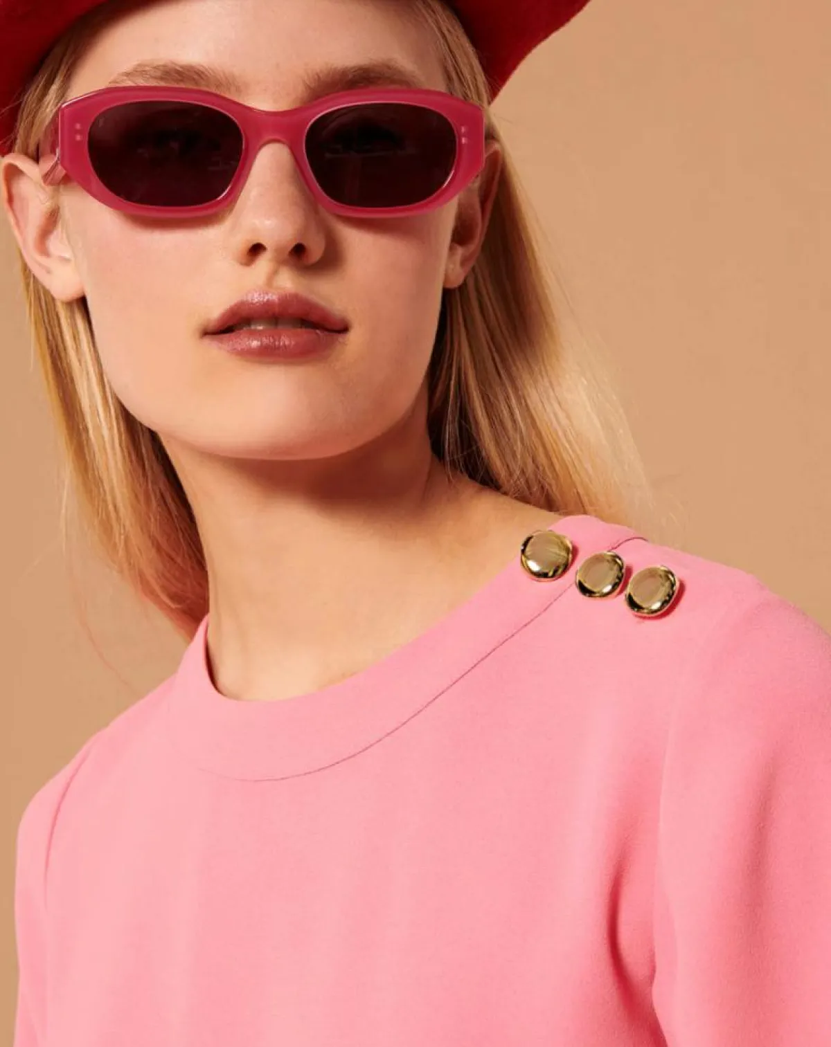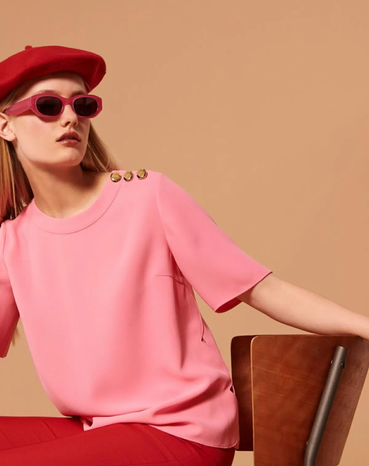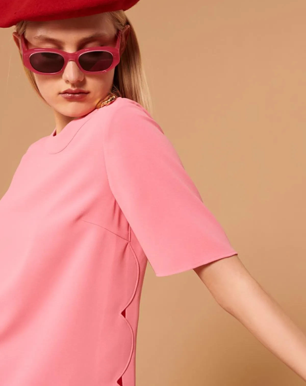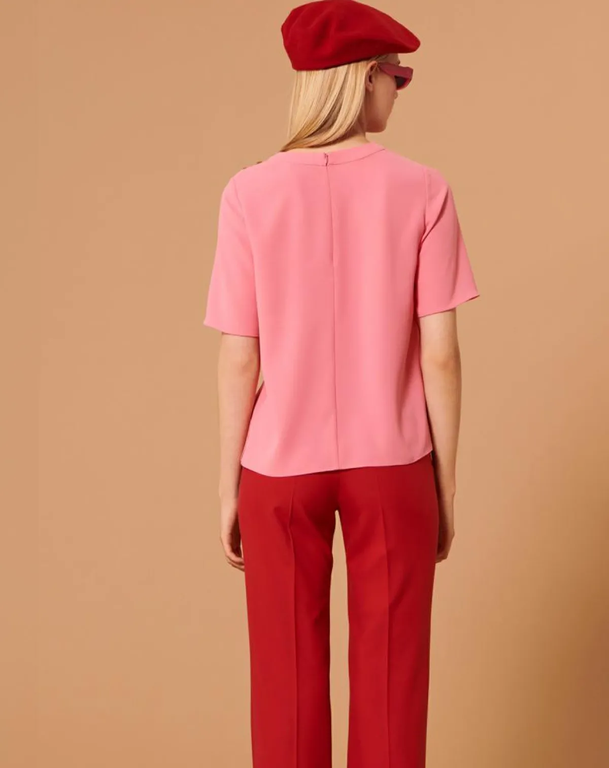 Ce haut couleur rose en crêpe possède des manches courtes évasée et une encolure ronde