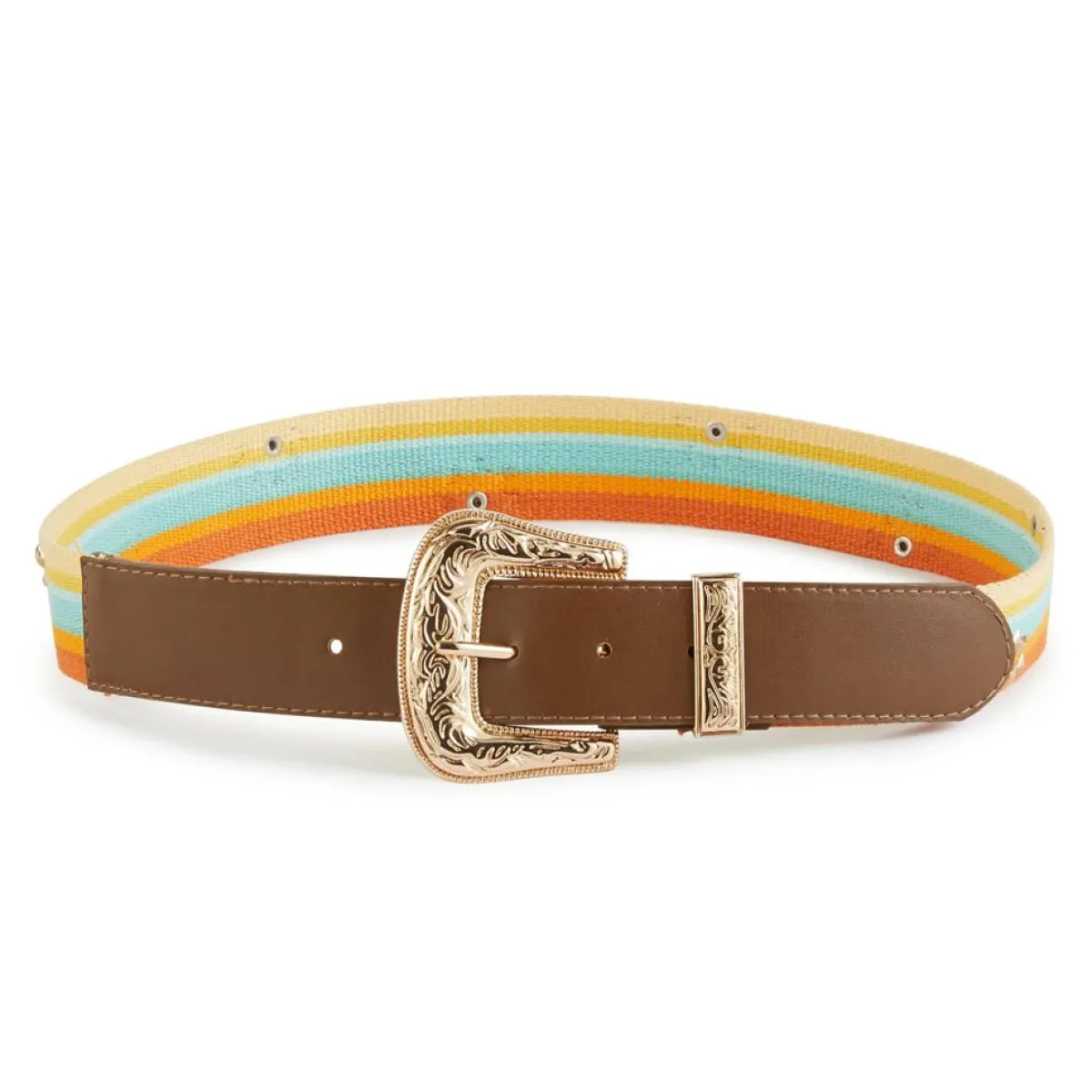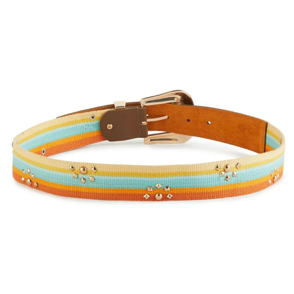 La ceinture Eneko est constituée d’une sangle multicolore en textile avec une boucle dorée