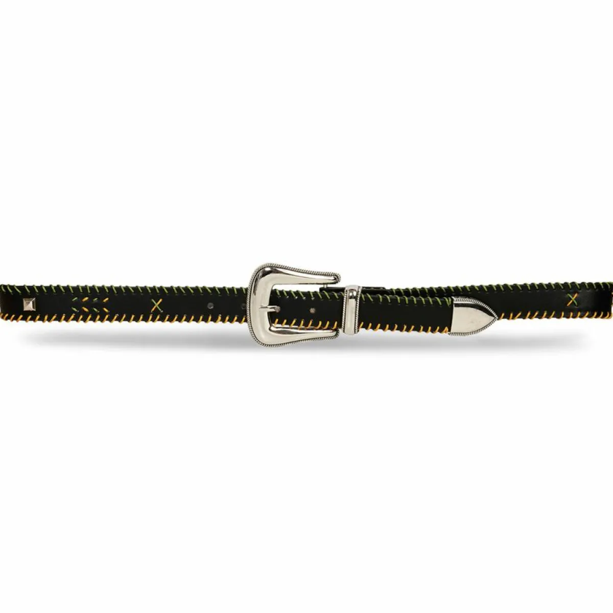 La ceinture effet cuir est marron gold ornée de fils marron chocolat et jaune ocre, et est décorée de clous argentés