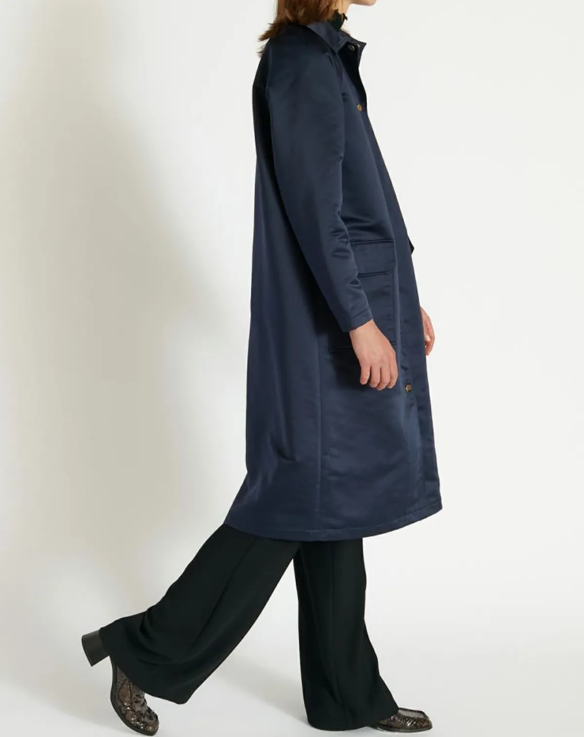Celui-ci fait office de manteau déperlant avec une rangée de boutons pression, deux poches à rabat et une nuance bleu marine passe-partout