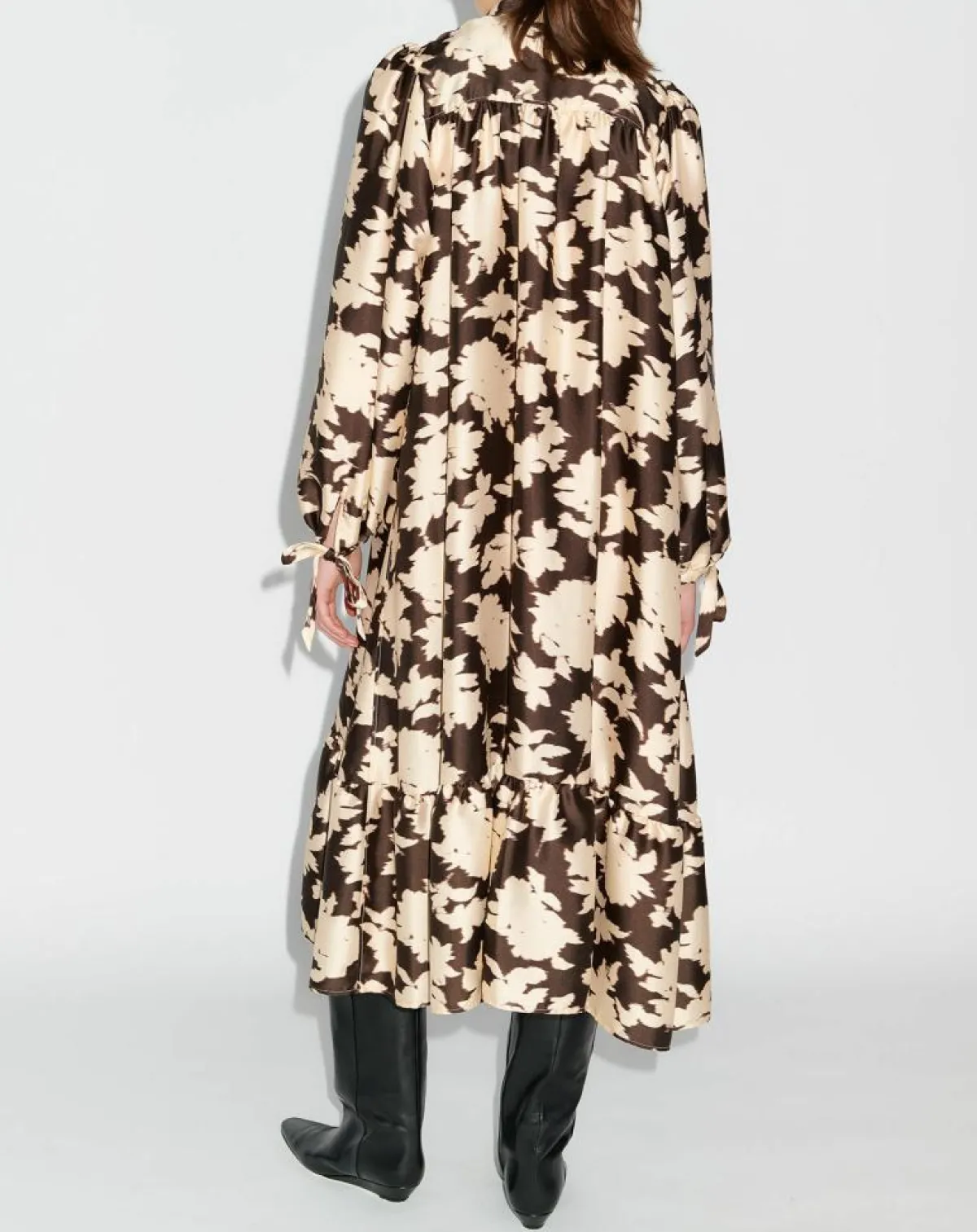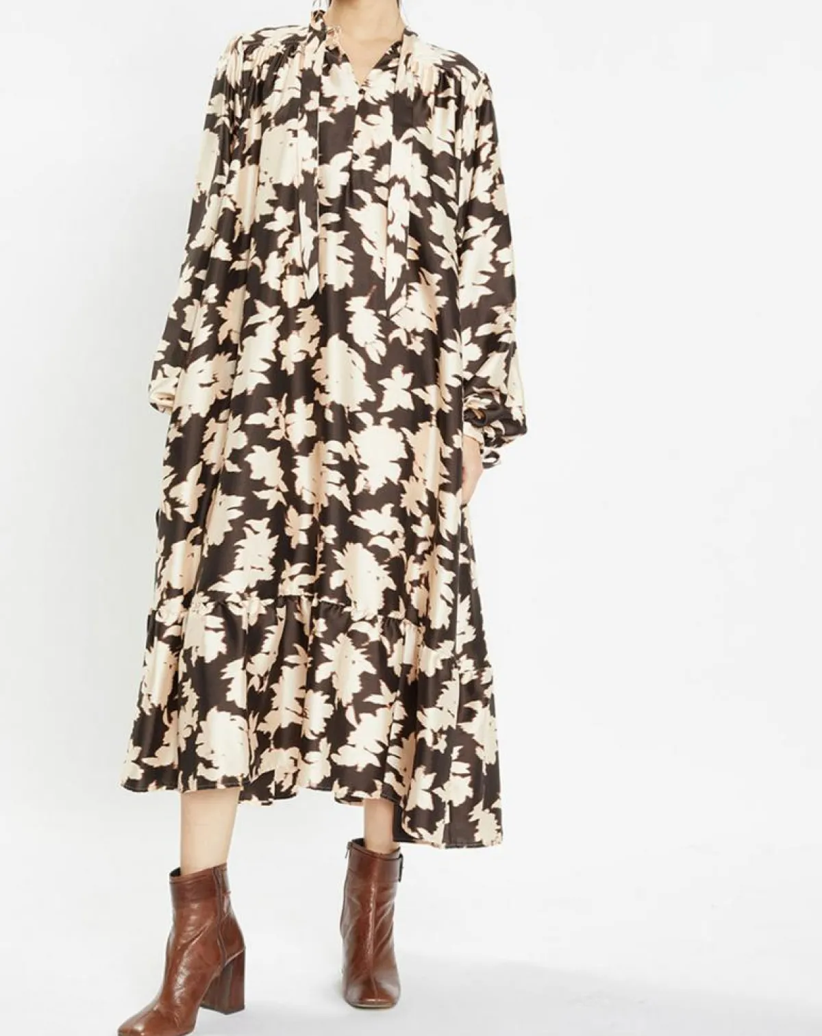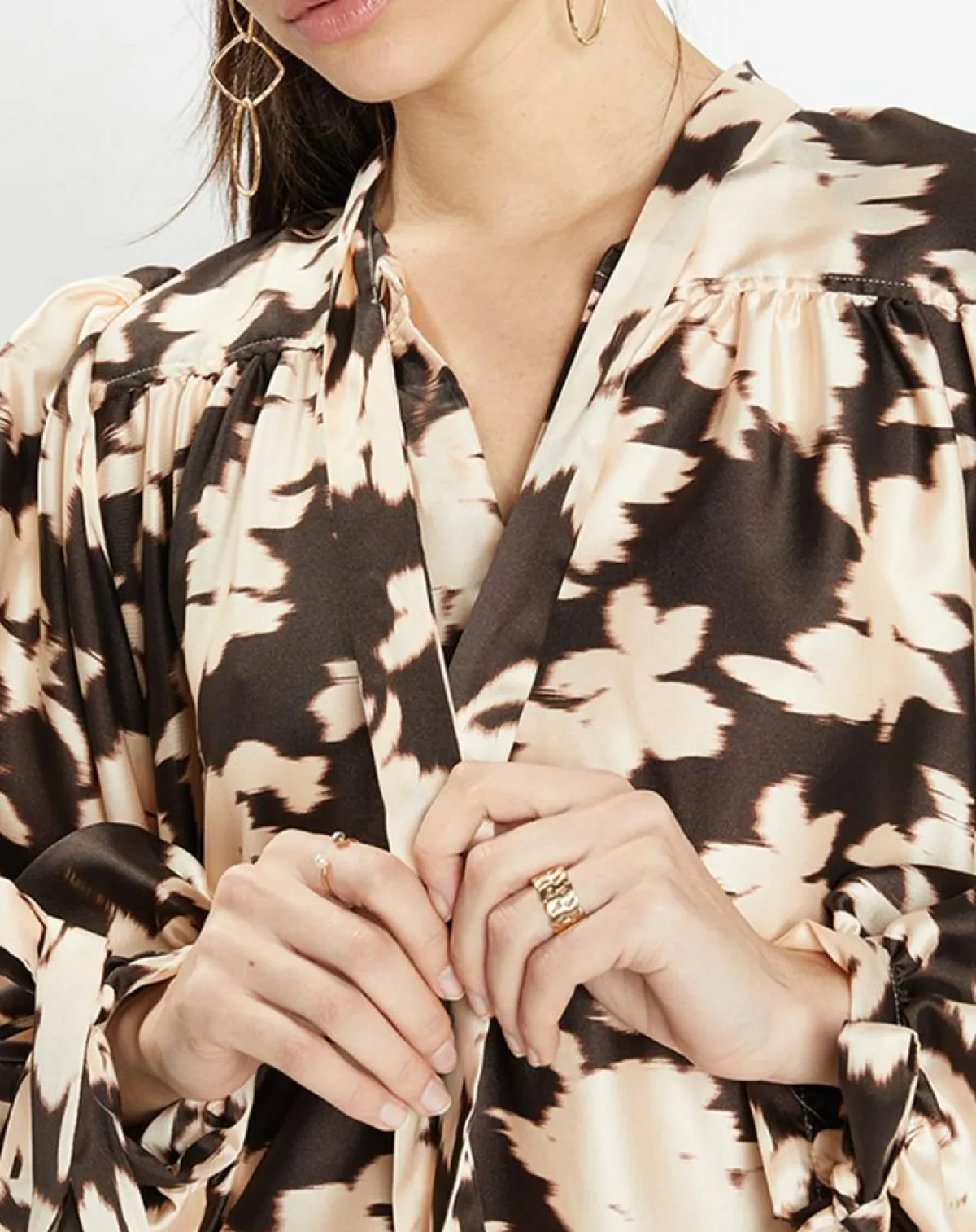 On adopte cette direction en optant pour un tissu fluide et large orné d’un imprimé beige et chocolat