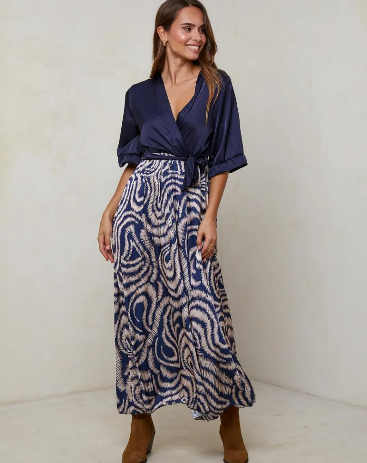 Robe longue col V manches trois quart avec motifs sur le bas ceinture à la taille