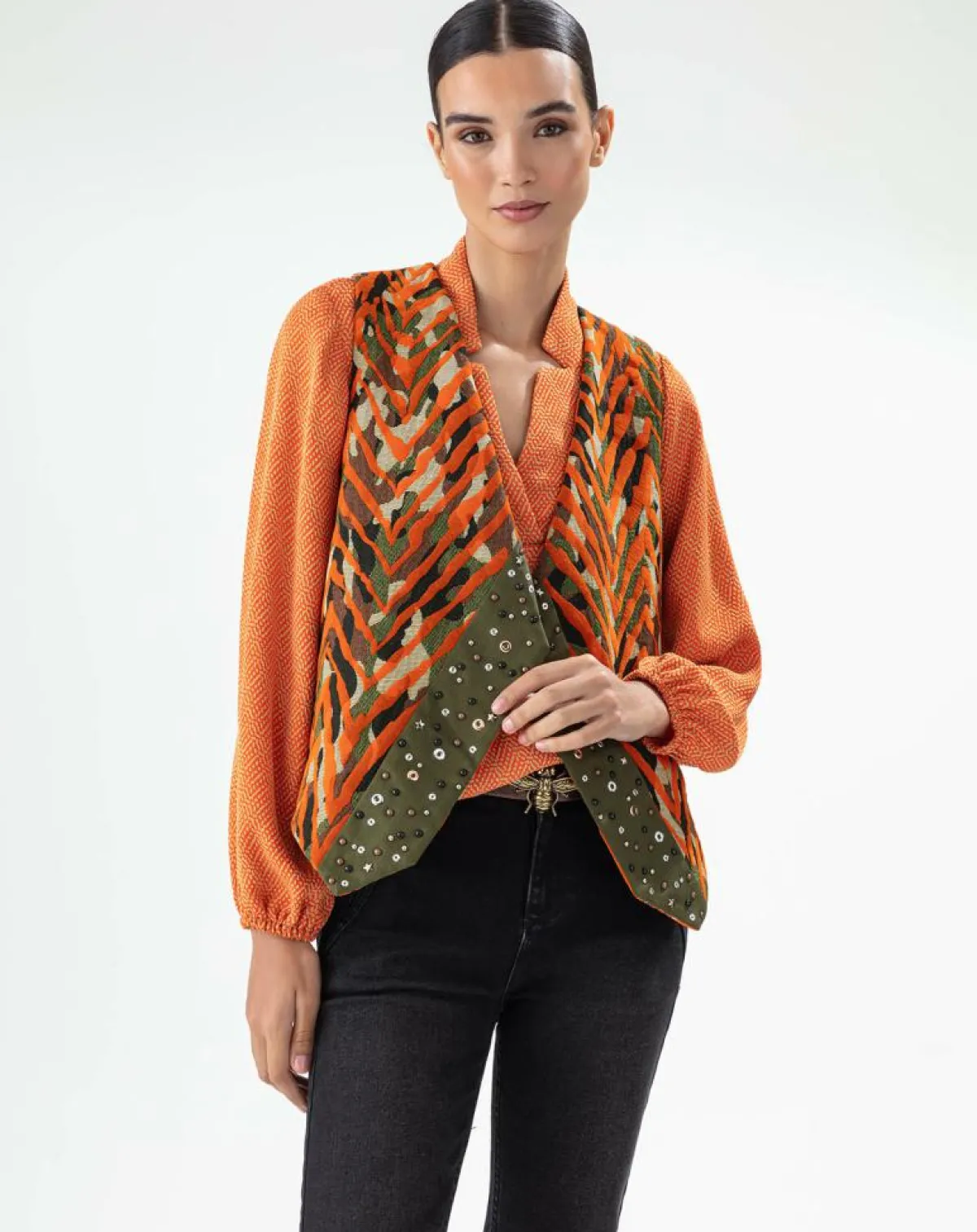 En jacquard orange et kaki zébré, vous l’associerez facilement à vos différentes blouses pour une tenue de soirée et à un col roulé noir pour un look plus décontracté