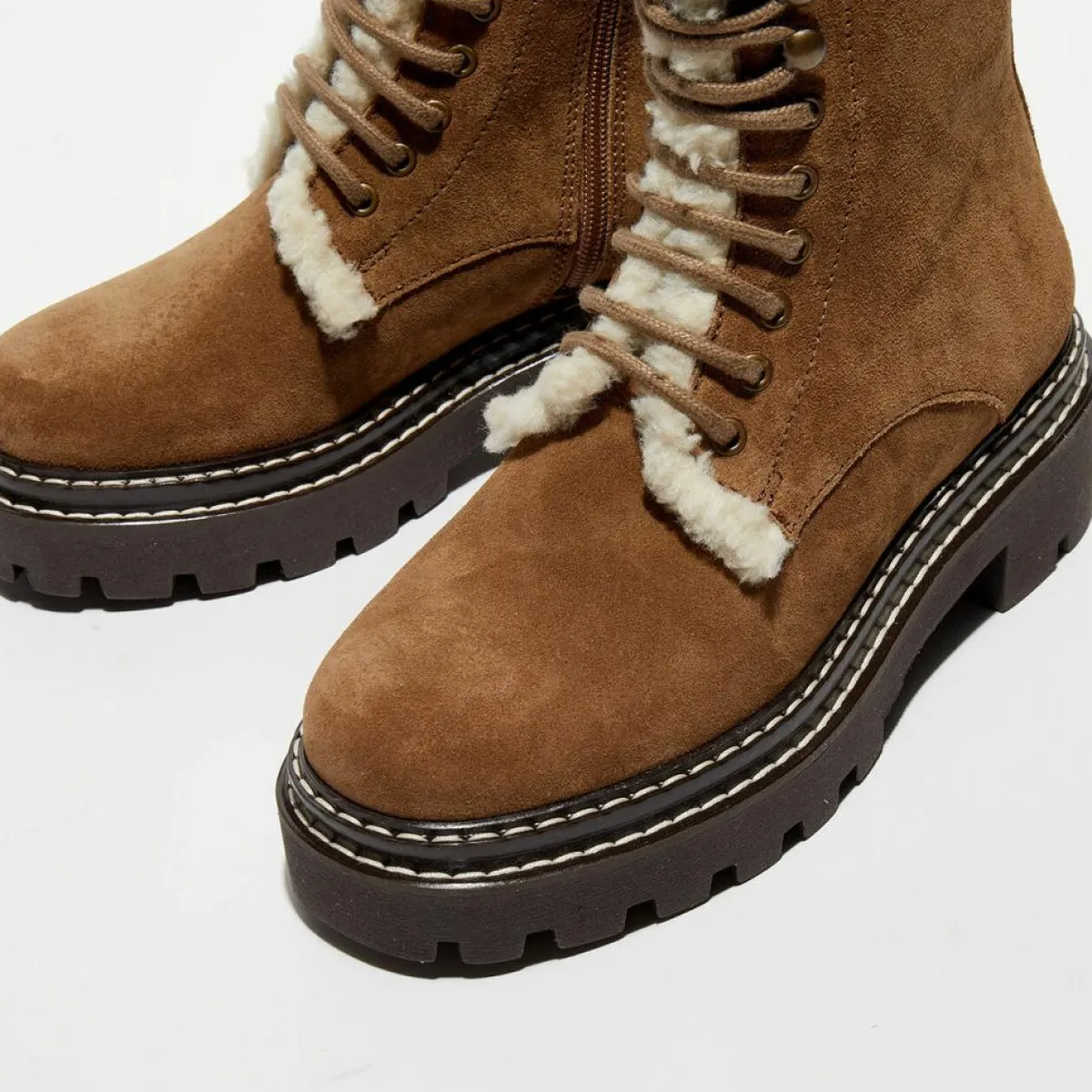 Elles proposent un bout arrondi, des détails duveteux, un laçage classique, une fermeture zippée latérale, des surpiqûres contrastées ainsi qu’un tirant d’aide à l’enfilage.