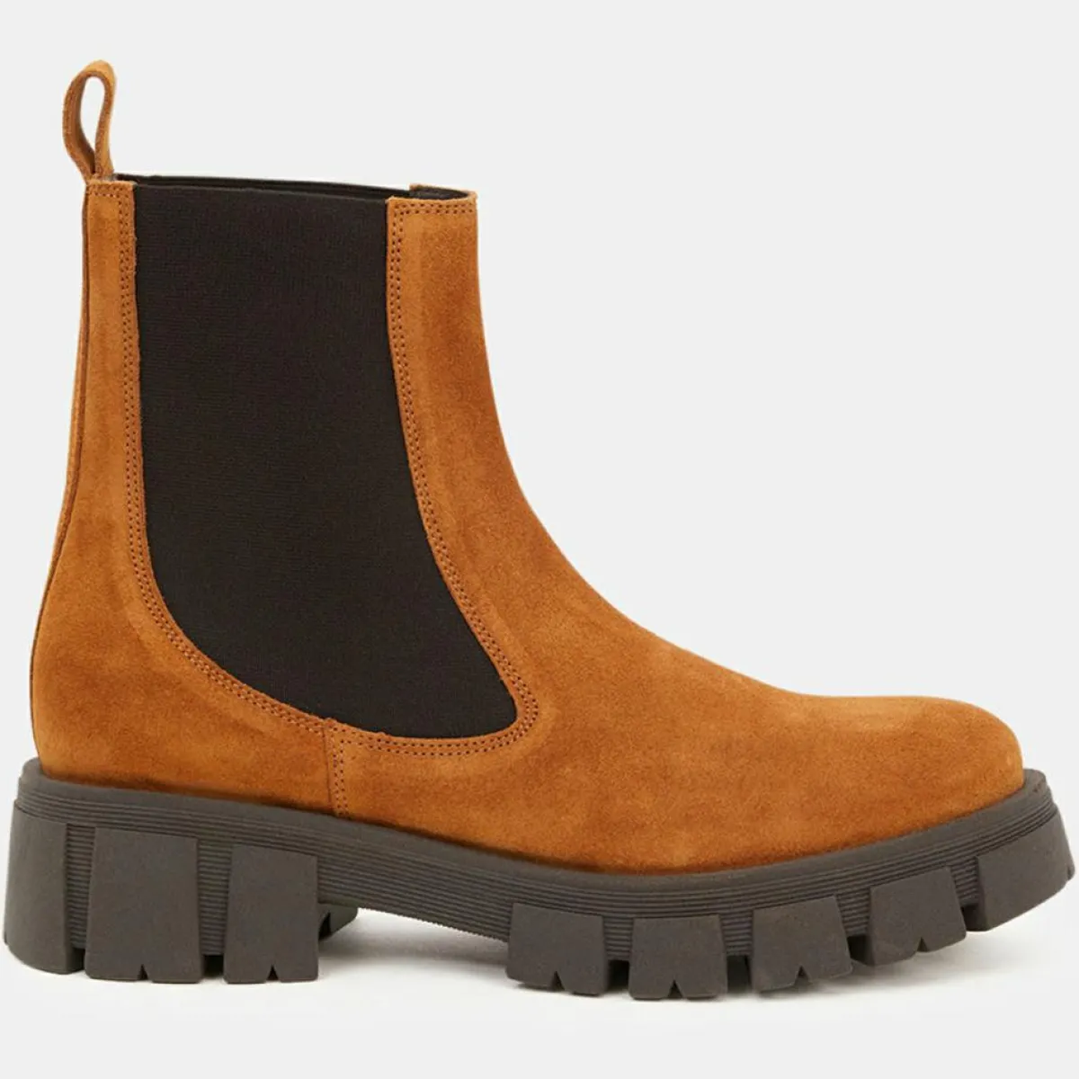 Ces bottines Chelsea chunky Galeries Lafayette confectionnées en cuir veau velours, disposent d’un bout rond, de goussets latéraux élastiqués, d’un tirant d’enfilage ainsi que d’un talon large.