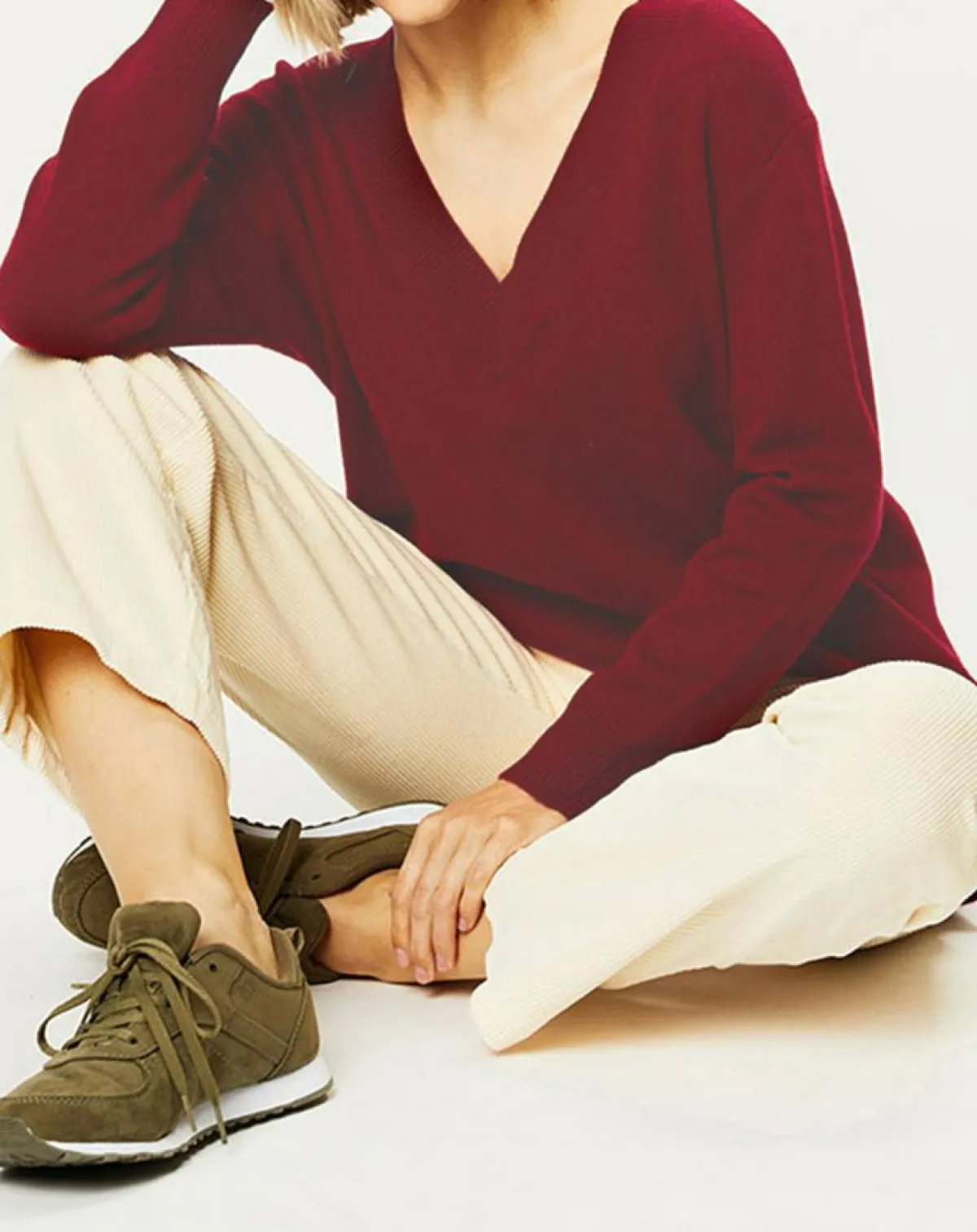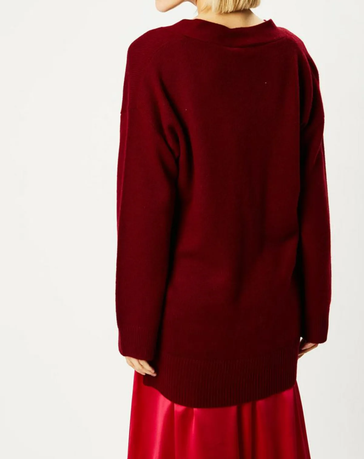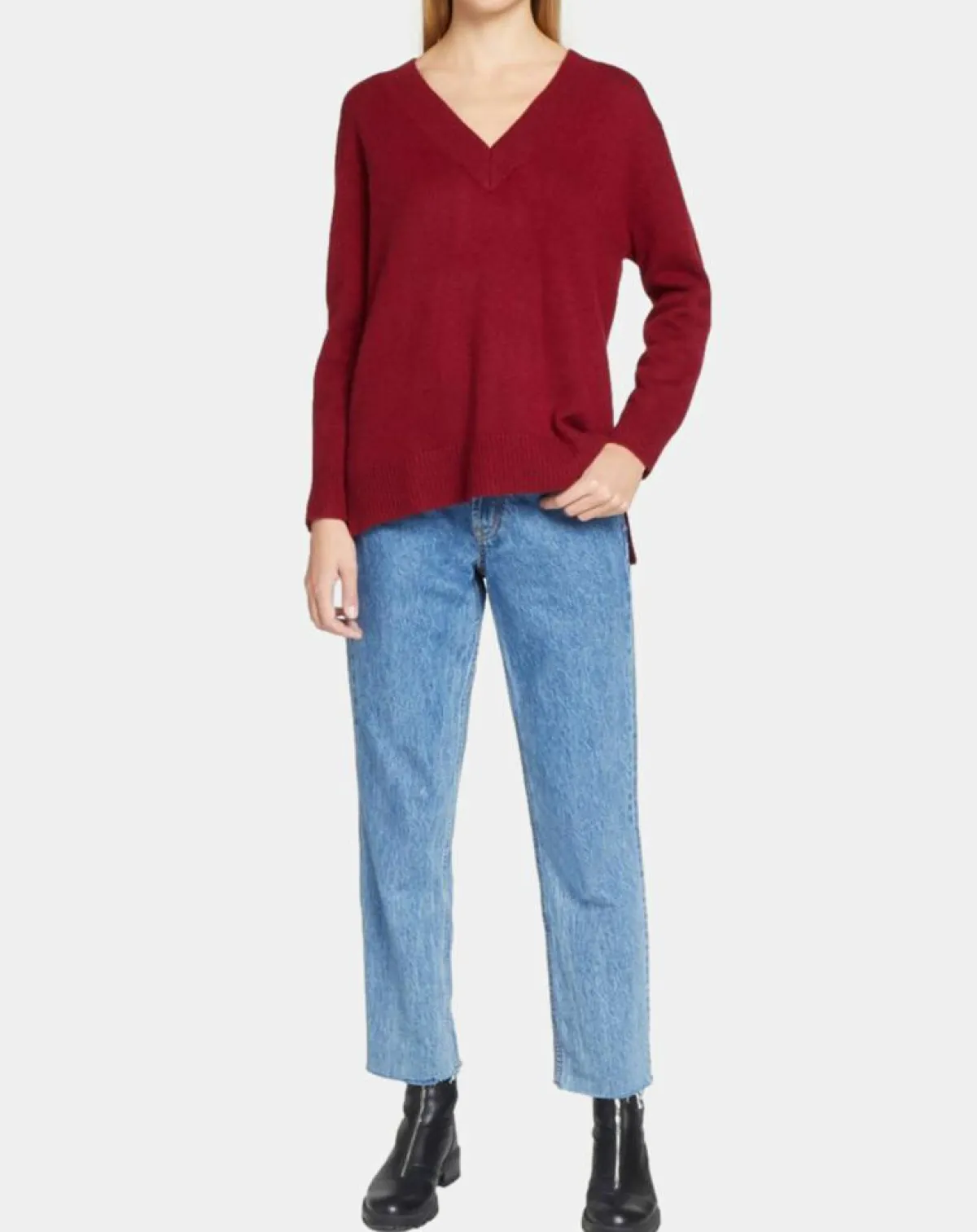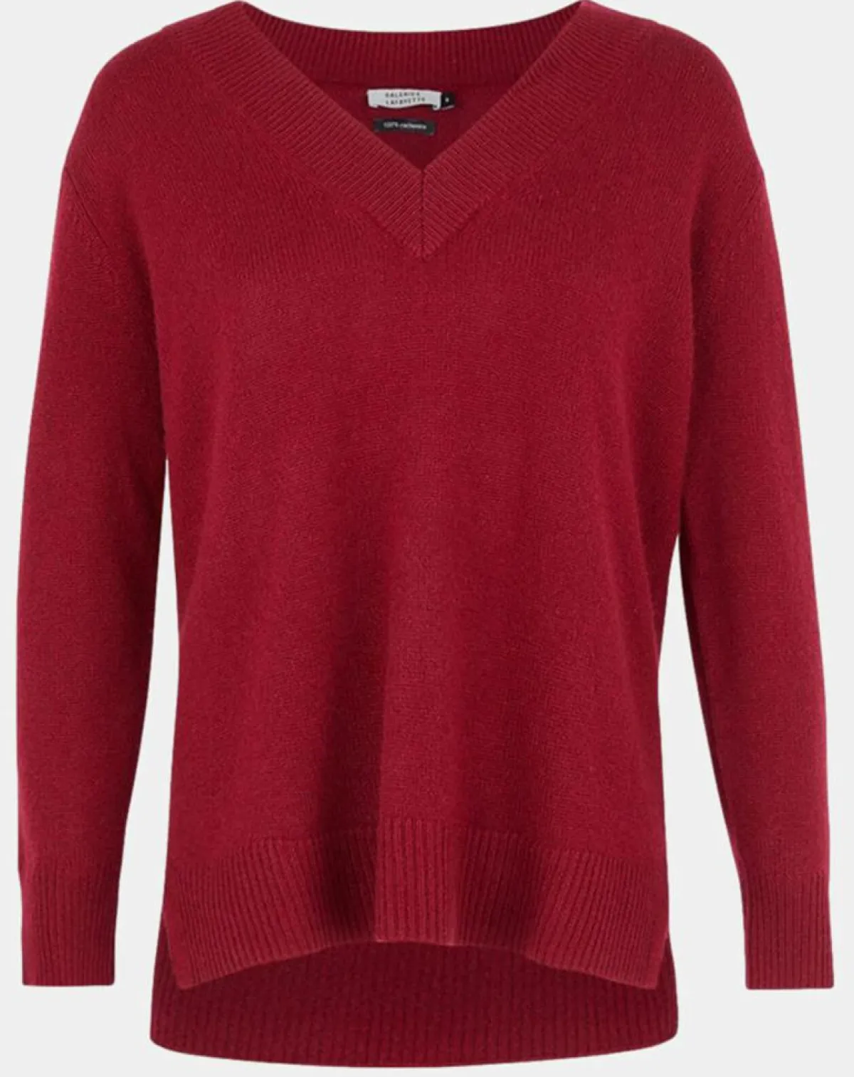 Ce pull droit en cachemire Galeries Lafayette est muni d’un col V, d’un ourlet asymétrique et de finitions côtelées.