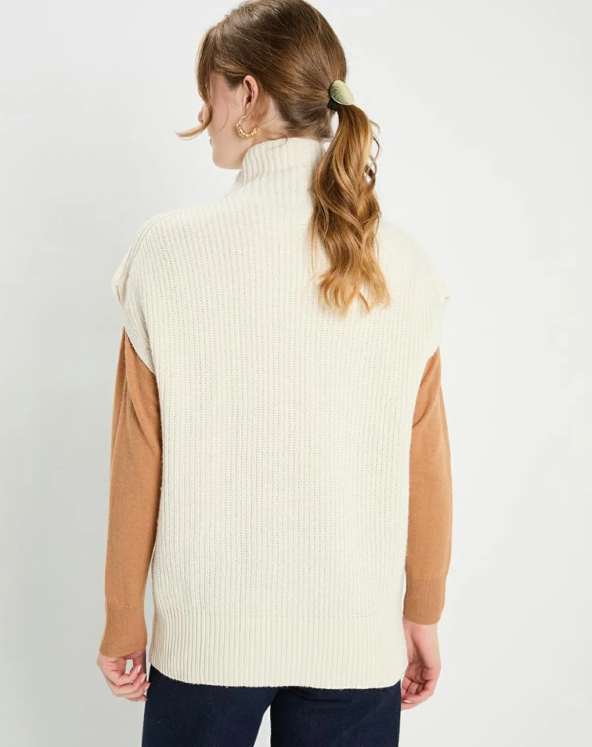 Ce pull sans manches Galeries Lafayette en laine et cachemire est muni d’un col montant et de finitions côtelées.