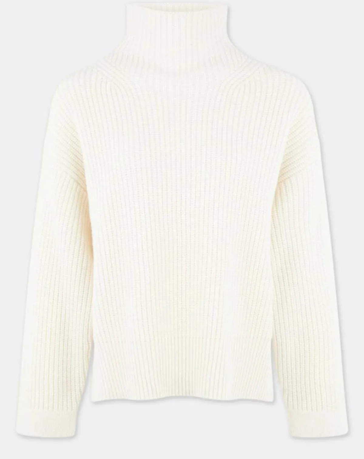 Ce pull Galeries Lafayette composé de laine et de cachemire responsable en maille à grosses côtes est muni d’un col montant et d’un ourlet fendu.